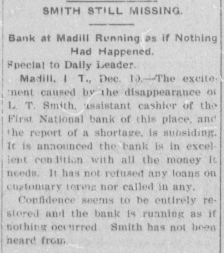 SMITH STILL MISSING. Bank at Madill Running as if Nothing Had Happened. Special to Daily Leader. Madill. I T., Dec. 10.-The excite. ment caused by the disappearance or L. T. Smith, assistant cashier of the First National bank of this place, and the report of a shortage, is subsiding. It is announced the bank is in excellent con lition with all the money It. needs. It has not refused any loans on customary terms nor called in any. Confidence seems to be entirely restored and the bank is running as if nothing occurred Smith has not been heard from