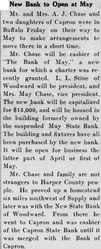 New Bank to Open at May Mr. and Mrs. A. J. Chase and two daughters of Capron were in Buffalo Friday on their way to May to make arrangements to move there in a short time. Mr. Chase will be cashier of "The Bank of May," a new bank for which a charter was recently granted. L. L. Stine of Woodward will be president, and Mrs. May Chase, vice president. The new bank will be capitalized for $15,000, and will be housed in the building formerly owned by the suspended May State Bank. The building and fixtures have all been purchased by the new bank. It will be open for business the latter part of April or first of May. Mr. Chase and family are not strangers to Harper County people. He proved up a homestead six miles southwest of Supply and later was with the New State Bank of Woodward. From there he went to Capron and was cashier of the Capron State Bank until it was merged with the Bank of Capron.