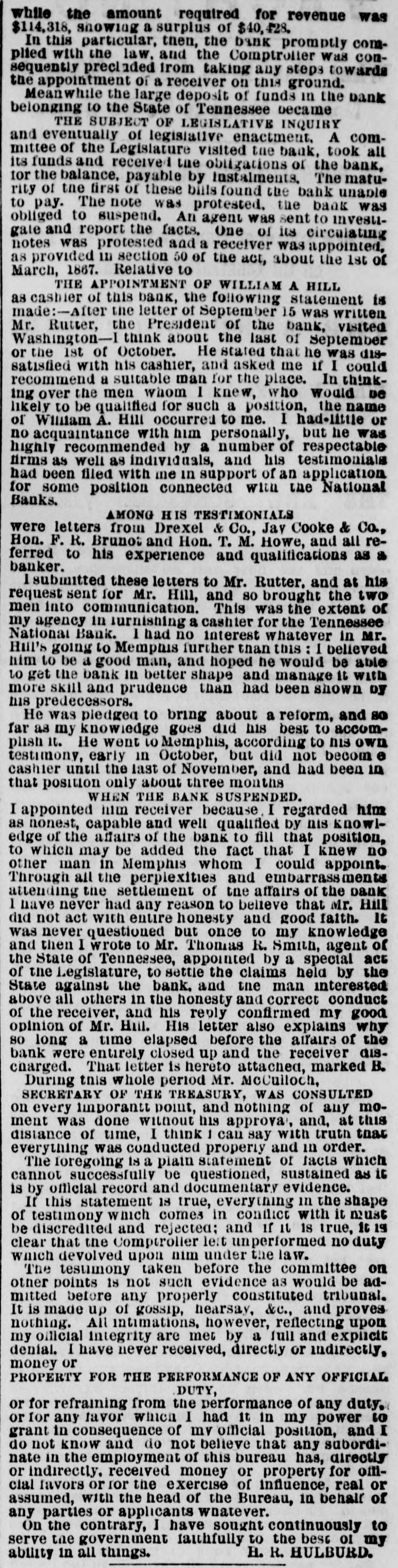 THE "SACRED" SCHOOL FUND. The Tennessee National Bond of Menaphis Refuses Payment-Rufter Declines to Come to a Consultation on the Subject-State Officials B neti claries-The Sacred Fund in Bad Way. From the Memphis Bulletin, Marell 21. The Tennessee National Bank closed yesterday at 2 o'clock. There have been various surmises and exaggerated reports as to the probable cause producing is sesulf. On inquiring we learn that theam mediate circumstances which oceanic are substantially as follows Abou filne months ago, be arrangement and pay of certain State officials, the Tennessee National Bank became the depository of the State funds for West Tennessee. A plic months ago Governer Brownlow, who as as all along acquainted with the fact, seized with a virtuous fear lest the fu is deposited in West Tennessee, by consen the officials for a consideration, should its lost, and the blame be justle laid alapria door. He therefore blowed aprillin State Treasurer, by calling the attention of the Legislature to the matter. That body of hungry patriots immediately dispatched a committee-ofwhich Spence, the President of the defunct Exchange Bank of Tennessee at Murtreesboro' was Chairman -to Memphis to demand the immediate payment of all the State funds, including the School fund. The officers of the Tennessee National Bank, it appears by the report of the committee to the Legislature, immediately paid over to the aforesaid Spence committee the sum of four hundred thousand dollars, and executed notes for the remainder of the State deposit. Subgenuently, S. Watson, Esq., assignee of the State Bank of Tennessee, at Nash ville, filed a bill in chancery to restrain the officers of the Tennessee National Bank from paying out any more of said funds to the Legislative committee, alleging that al of was to him School the said fund, funds, largely properly composed assigned the for the benefit of the stockholders of said bank; and recently an order to this effect was served on George R. Rutter, Esq. President of the National Bank in this city. Last Saturday one of the notes of the Tennessee National Bank of this city, given to the Legislative committee, fell due, and the President, George R. Rutter, Esq., act ing under the advice of the best legal counsel, refused its payment. Yesterday a dispatch was received from officials at Nashville to the effect that "matters were so complicated" that the presence of George Rutter, Esq, was desired there in consultation. It is understood that he declined to go there to hold a "consultation," and in consequence we stall doubtless be favored with the presence of some of the State officials, for said consultation, in a few days. It is due to the officers of the bank to say that all the ordinary demands have been met, and that it is scarcely likely that a single depositor will lose a cent by the closing of the bank. It seems probable, from all we can now learn, that if the State authorities push the payment of the notes given the Legislative committee, there will be no settlement of the difficulty except at the end of an interminable law suit.