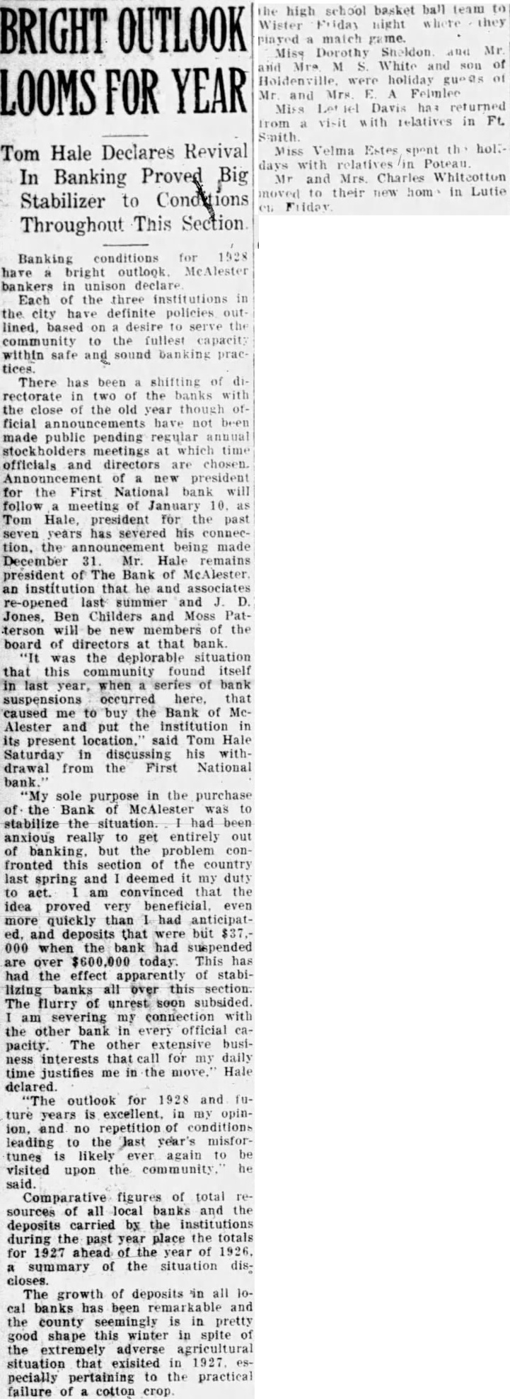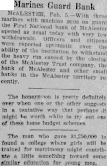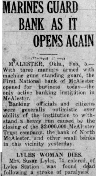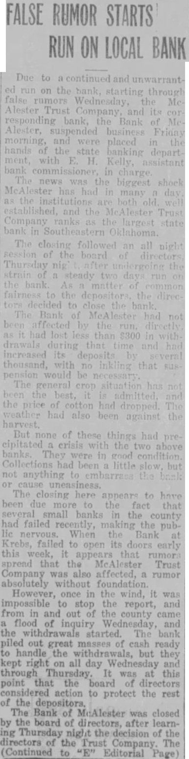 FALSE RUMOR STARTS RUN ON LOCAL BANK Due on the starting through false rumors Alester Trust Company and responding bank, the Bank of Alester, suspended business morning, and placed hands the banking depart with charge the biggest many and Company The closing followed board steady fairness decided Bank deposits thousand, that would The cotton had dropped had also been against But none of these things had cipitated crisis with the two above banks. They were in good Collections had been little but not anything or The closing here appears to have been due more the fact that several small banks in the county had failed recently, making the pubWhen Bank Krebs, failed to open its doors early this week, rumors spread that the IcAlester Trust Company was also affected, a rumor without foundation However, once in the wind, it was impossible to stop the report, and from and out of the county came flood of inquiry Wednesday, and the withdrawals started. The bank piled out great masses of cash ready to handle the but they kept right on all day Wednesday and through Thursday. It was at this point the board of directors considered action to protect the rest of the The Bank of McAlester was closed by the board of directors, after learning Thursday night the decision of the directors of the Trust The Company (Continued to Editorial Page)