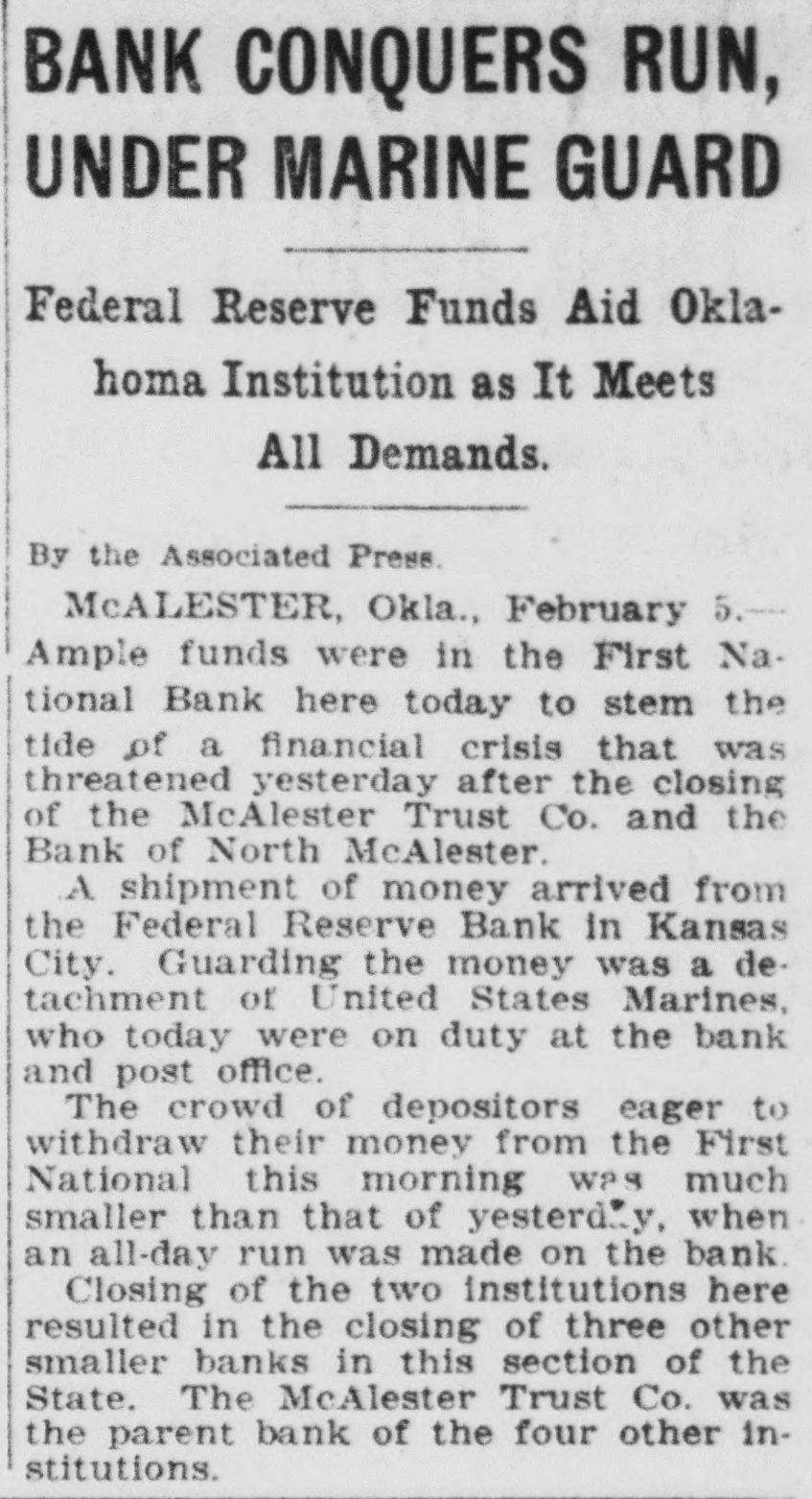 BANK CONQUERS RUN, UNDER MARINE GUARD Federal Reserve Funds Aid Oklahoma Institution as It Meets All Demands. By the Associated Press. McALESTER, Okla., February 5.Ample funds were in the First National Bank here today to stem the tide of a financial crisis that was threatened yesterday after the closing of the McAlester Trust Co. and the Bank of North McAlester. A shipment of money arrived from the Federal Reserve Bank in Kansas City. Guarding the money was a detachment of United States Marines, who today were on duty at the bank and post office. The crowd of depositors eager to withdraw their money from the First National this morning was much smaller than that of yesterd.y. when an all-day run was made on the bank. Closing of the two institutions here resulted in the closing of three other smaller banks in this section of the State. The McAlester Trust Co. was the parent bank of the four other institutions.