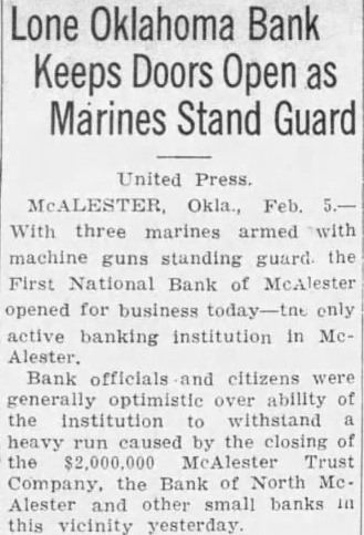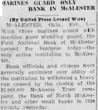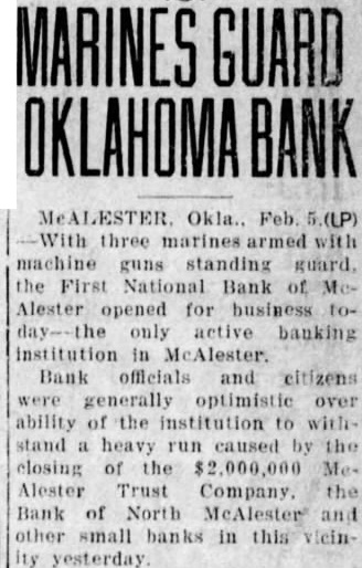 Marines Guard Only Bank Left In Oklahoma Town M'ALESTER Feb. (United three marines armed with machine guns standing guard the First National Bank McAlester opened for business today-the only active banking institution McAlester. Bank officials and citizens were optimistic over ability of the institution to withstand caused by the closing of the $2,000,000 McAlester Trust Company, the Bank of North McAlester and other small banks this cinity yesterday.