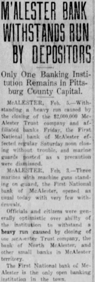 United Press. McALESTER, Okla., Feb. With three marines armed with machine guns standing guard the First National Bank of McAlester opened for business today-tne only active banking institution in McAlester. Bank officials and citizens were generally optimistic over ability of the institution to withstand heavy run caused by the closing of the $2,000,000 McAlester Trust Company, the Bank of North Mc. Alester and other small banks in this vicinity yesterday.