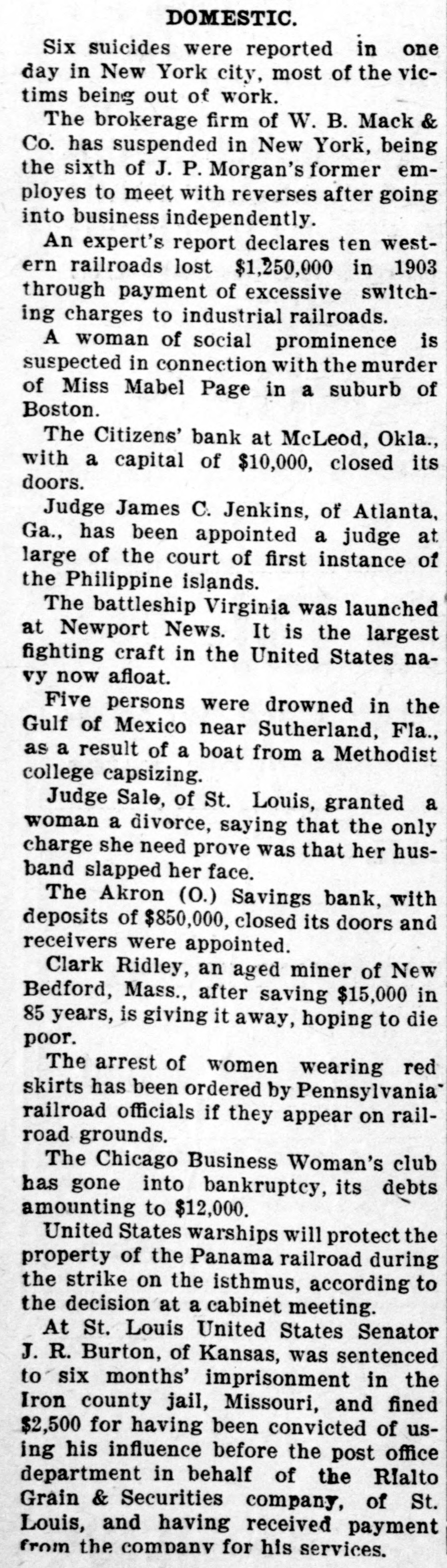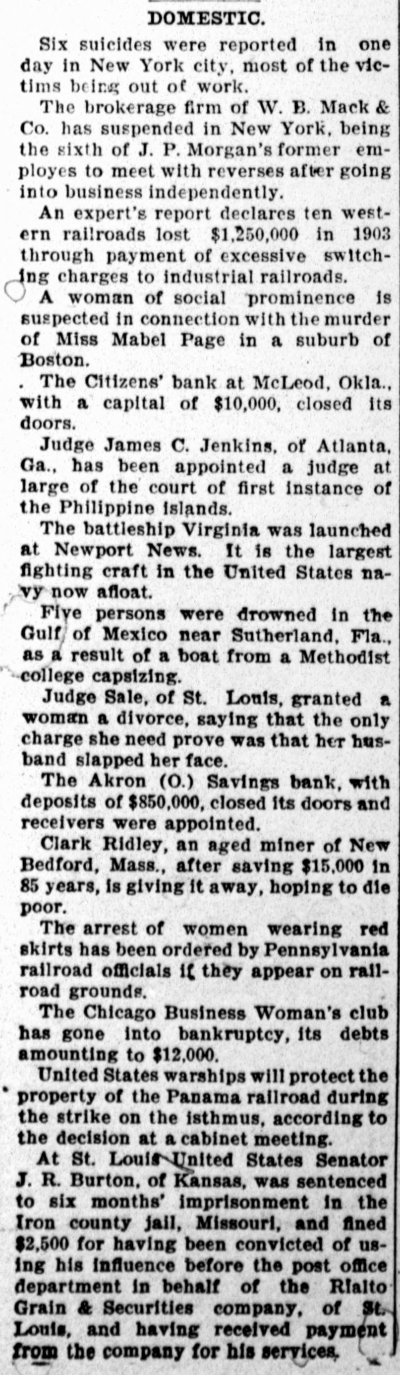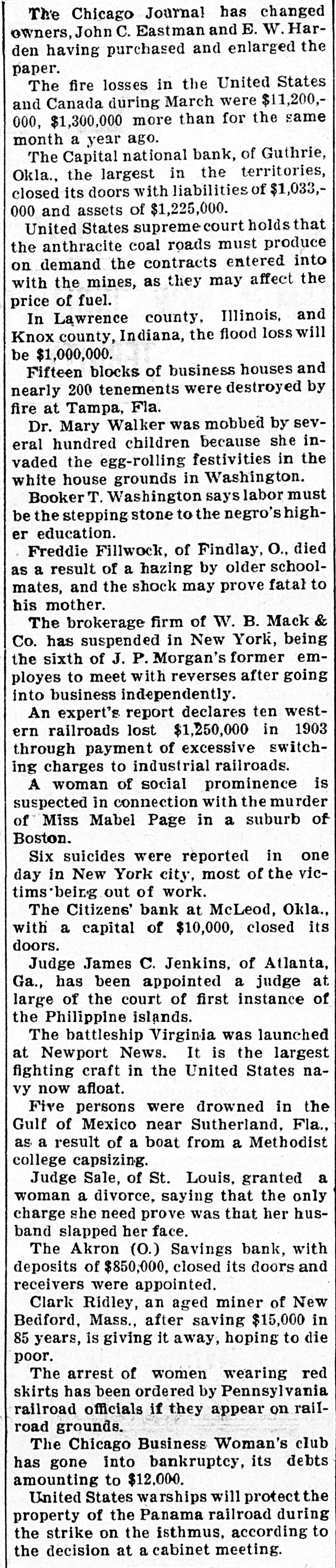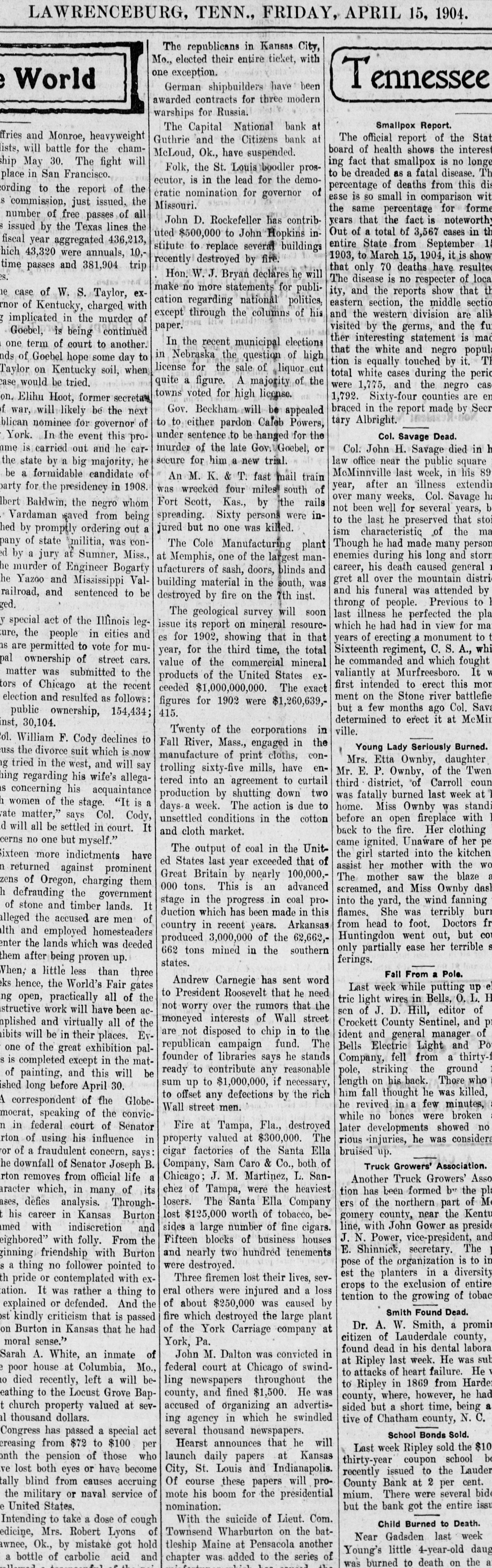 LAWRENCEBURG, TENN., FRIDAY, APRIL 15, 1904. The republicans in Kansas City, Mo., elected their entire ticket, with one exception. World Tennessee German shipbuilders have been awarded contracts for three modern warships for Russia. Smallpox Report. The Capital National bank at ffries and Monroe, heavyweight Guthrie and the Citizens bank at The official report of the Stat ists, will battle for the chamboard of health shows the interest McLoud, Ok., have suspended. ing fact that smallpox is no longe ship May 30. The fight will Folk, the St. Louis boodler prosto be dreaded as a fatal disease. Th place in San Francisco. ecutor, is in the lead for the demopercentage of deaths from this dis ording to the report of the cratic nomination for governor of ease is so small in comparison wit commission, just issued, the Missouri. the same percentage for forme number of free passes of all John D. Rockefeller has contribyears that the fact is noteworthy issued by the Texas lines the Out of a total of 3,567 cases in th uted $500,000 to John Hopkins infiscal year aggregated 436,213, entire State from September 1 stitute to replace several buildings hich 43,320 were annuals, 10,1903, to March 15, 1904, it is show recently destroyed by fire. time passes and 381,904 trip that only 70 deaths have resulte Hon. W.J. Bryan declares he will The disease is no respecter of local make no more statements for publiity, and the reports show that th e case of W. S. Taylor, excation regarding national politics, eastern section, the middle sectio rnor of Kentucky, charged with and the western division are alik except through the columns of his implicated in the murder of paper. visited by the germs, and the fui Goebel, is being continued ther interesting statement is mad one term of court to another. In the recent municipal elections that the white and negro popula in Nebraska the question of high nds of Goebel hope some day to tion is equally touched by it. T license for the sale of liquor cut Taylor on Kentucky soil, when total white cases during the perio case, would be tried. quite a figure. A majority of the were 1,775, and the negro cas towns voted for high license. 1,792. Sixty-four counties are en on. Elihu Hoot, former secretary braced in the report made by Seer f war, will likely be the next Gov. Beckham will be appealed tary Albright. to to either pardon Caleb Powers, blican nominee for governor of under sentence to be changed for the Col. Savage Dead. York. In the event this proame is carried out and he carmurder of the late Gov. Goebel, or Col. John H. Savage died in h secure for him a new trial. law office near the public square the state by a big majority, he McMinnville last week, in his 89 be a formidable candidate of An M. K. & T. fast mail train year, after an illness extendir party for the presidency in 1908. was wrecked four miles south of over many weeks. Col. Savage ha Fort Scott, Kas., by the rails Ibert Baldwin, the negro whom not been well for several years, b spreading. Sixty persons were inVardaman saved from being to the last he preserved that stoi jured but no one was killed. hed by promptly ordering out a ism characteristic of the ma pany of state militia, was conThough he had made many person The Cole Manufacturing plant ed by a jury at Sumner, Miss., enemies during his long and storn at Memphis, one of the largest mancareer, his death caused general ne murder of Engineer Bogarty ufacturers of sash, doors, blinds and gret all over the mountain distri the Yazoo and Mississippi Valbuilding material in the south, was and his funeral was attended by railroad, and sentenced to be destroyed by fire on the 7th inst. 1 ged. throng of people. Previous to The geological survey will soon last illness he perfected the pla y special act of the Illinois legwhich he had had in view for ma issue its report on mineral resourcure, the people in cities and years of erecting a monument to t es for 1902, showing that in that hs are permitted to vote for muSixteenth regiment, C. S. A., whi year, for the third time, the total pal ownership of street cars. he commanded and which fought value of the commercial mineral matter was submitted to the valiantly at Murfreesboro. It products of the United States exfirst intended to erect this mon tors of Chicago at the recent ceeded $1,000,000,000. The exact ment on the Stone river battlefie election and resulted as follows: figures for 1902 were $1,260,639,but a few months ago Col. Sava 415. public ownership, 154,434; determined to erect it at McMir inst, 30,104. ville. Twenty of the corporations in ol. William F. Cody declines to Fall River, Mass., engaged in the Young Lady Seriously Burned. uss the divorce suit which is now manufacture of print cloths, conMrs. Etta Ownby, daughter g tried in the west, and will say trolling sixty-five mills, have enMr. E. P. Ownby, of the Twen hing regarding his wife's allegatered into an agreement to curtail third district, of Carroll coun is concerning his acquaintance production by shutting down two was fatally burned last week at 1 women of the stage. "It is a days-a week. The action is due to home. Miss Ownby was standi rate matter," says Col. Cody, unsettled conditions in the cotton before an open fireplace with d will all be settled in court. It and cloth market. back to the fire. Her clothing cerns no one but myself." came ignited. Unaware of her pe The output of coal in the Unitthe girl started into the kitchen Sixteen more indictments have ed States last year exceeded that of assist her mother with the WO n returned against prominent Great Britain by nearly 100,000,The mother saw the blaze zens of Oregon, charging them 000 tons. This is an advanced screamed, and Miss Ownby das h defrauding the government into the yard, the wind fanning stage in the progress in coal proof stone and timber lands. It duction which has been made in this flames. She was terribly burn alleged the accused are men of from head to foot. Doctors fr co
