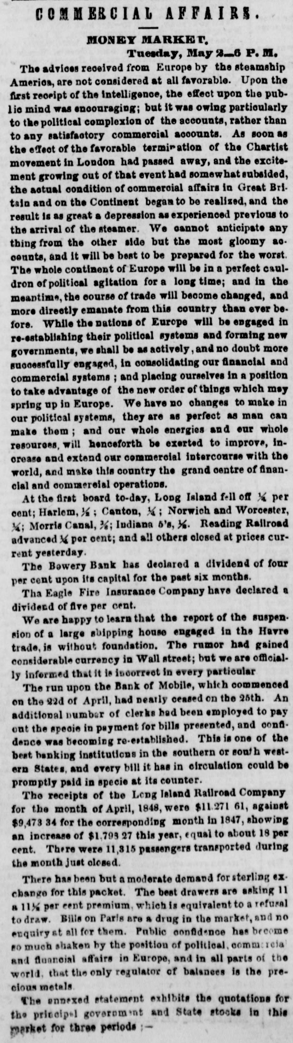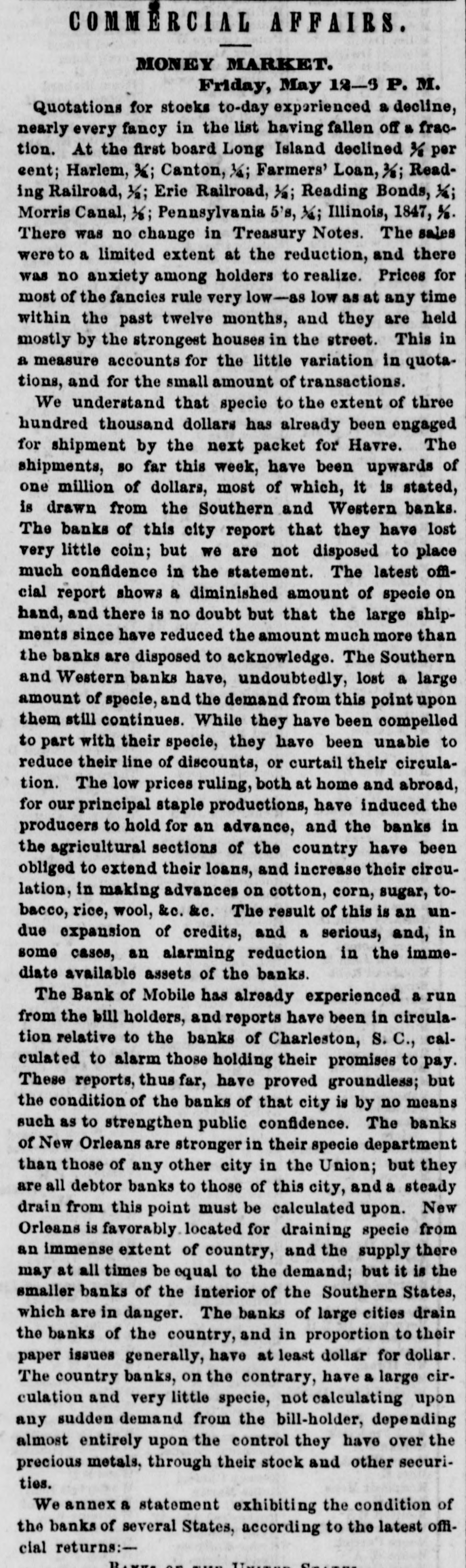 IMMERCIAL AFFAIRS. MONEY MARKET. Friday, May 12-3 P. M. Quotations for stocks to-day experienced a decline, nearly every fancy in the list having fallen off a fraction. At the first board Long Island declined 3/8 per cent; Harlem, 3/6; Canton, 1/4; Farmers' Loan, 3/6; Reading Railroad, /; Erie Railroad, 1/a; Reading Bonds, 1/4; Morris Canal, 1/6; Pennsylvania 5's, 1/6; Illinois, 1847, 1/8. There was no change in Treasury Notes. The sales were to a limited extent at the reduction, and there was no anxiety among holders to realize. Prices for most of the fancies rule very low-as low as at any time within the past twelve months, and they are held mostly by the strongest houses in the street. This in a measure accounts for the little variation in quotations, and for the small amount of transactions. We understand that specie to the extent of three hundred thousand dollars has already been engaged for shipment by the next packet for Havre. The shipments, BO far this week, have been upwards of one million of dollars, most of which, it is stated, is drawn from the Southern and Western banks. The banks of this city report that they have lost very little coin; but we are not disposed to place much confidence in the statement. The latest official report shows a diminished amount of specie on hand, and there is no doubt but that the large shipments since have reduced the amount much more than the banks are disposed to acknowledge. The Southern and Western banks have, undoubtedly, lost a large amount of specie, and the demand from this point upon them still continues. While they have been compelled to part with their specie, they have been unable to reduce their line of discounts, or curtail their circulation. The low prices ruling, both at home and abroad, for our principal staple productions, have induced the producers to hold for an advance, and the banks in the agricultural sections of the country have been obliged to extend their loans, and increase their circulation, in making advances on cotton, corn, sugar, tobacco, rice, wool, &c. &c. The result of this is an undue expansion of credits, and a serious, and, in some cases, an alarming reduction in the immediate available assets of the banks. The Bank of Mobile has already experienced a run from the bill holders, and reports have been in circulation relative to the banks of Charleston, S.C., calculated to alarm those holding their promises to pay. These reports, thus far, have proved groundless; but the condition of the banks of that city is by no means such as to strengthen public confidence. The banks of New Orleans are stronger in their specie department than those of any other city in the Union; but they are all debtor banks to those of this city, and a steady drain from this point must be calculated upon. New Orleans is favorably located for draining specie from an immense extent of country, and the supply there may at all times be equal to the demand; but it is the smaller banks of the interior of the Southern States, which are in danger. The banks of large cities drain the banks of the country, and in proportion to their paper issues generally, have at least dollar for dollar. The country banks, on the contrary, have a large circulation and very little specie, not calculating upon any sudden demand from the bill-holder, depending almost entirely upon the control they have over the precious metals. through their stock and other securities. We annex a statement exhibiting the condition of the banks of several States, according to the latest official returns:-