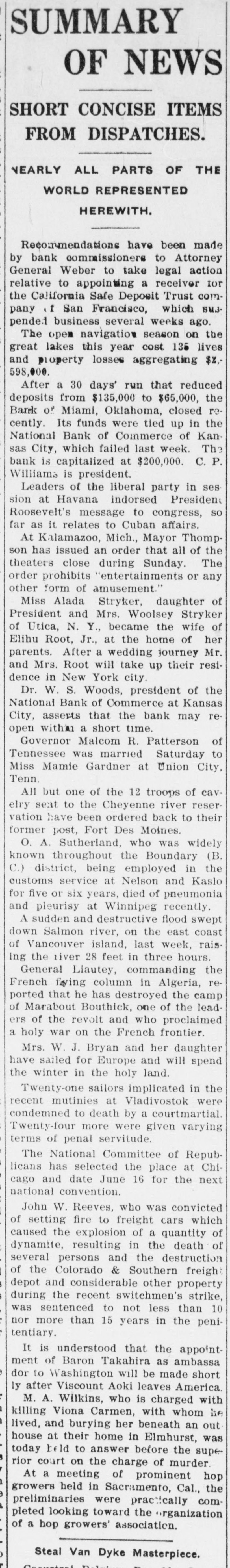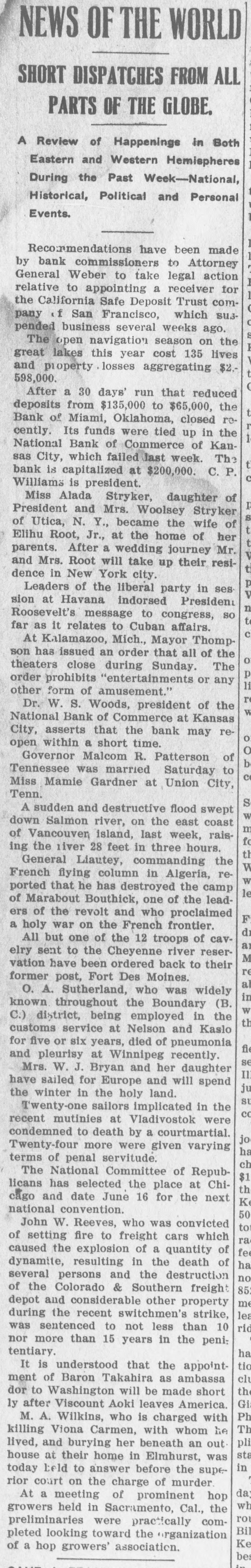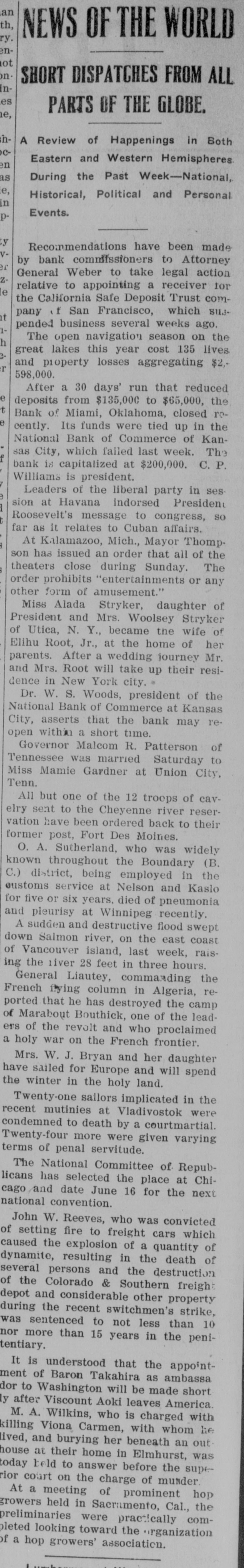 an th, NEWS OF THE WORLD eniot SHORT DISPATCHES FROM ALL es ie, PARTS OF THE GLOBE. nA Review of Happenings in Both cn Eastern and Western Hemispheres as During the Past Week-National, e, Historical, Political and Personal n Events. y $ Recommendations have been made f by bank commissioners to Attorney ZGeneral Weber to take legal action e relative to appointing a receiver for the California Safe Deposit Trust comit pany f San Francisco, which suspended business several weeks ago. h The open navigation season on the great lakes this year cost 135 lives r and pioperty losses aggregating $2.598,000. After a 30 days' run that reduced deposits from $135,000 to $65,000, the t Bank of Miami, Oklahoma, closed recently. Its funds were tied up in the National Bank of Commerce of Kansas City, which failed last week. The bank is capitalized at $200,000. C. P. Williams is president. Leaders of the liberal party in ses sion at Havana indorsed President Roosevelt's message to congress, SO far as it relates to Cuban affairs. At Kalamazoo, Mich., Mayor Thompson has issued an order that all of the theaters close during Sunday. The order prohibits "entertainments or any other form of amusement." Miss Alada Stryker, daughter of President and Mrs. Woolsey Stryker of Utica, N. Y., became the wife of Elihu Root, Jr., at the home of her parents. After a wedding journey Mr. and Mrs. Root will take up their residence in New York city. Dr. W. S. Woods, president of the National Bank of Commerce at Kansas City, asserts that the bank may reopen within a short time. Governor Malcom R. Patterson of Tennessee was married Saturday to Miss Mamie Gardner at Union City, Tenn. All but one of the 12 troops of cavelry sent to the Cheyenne river reservation have been ordered back to their former post, Fort Des Moines. O. A. Sutherland, who was widely known throughout the Boundary (B. C.) district, being employed in the customs service at Nelson and Kaslo for five or six years, died of pneumonia and pleurisy at Winnipeg recently. A sudden and destructive flood swept down Salmon river, on the east coast of Vancouver island, last week, raising the iiver 28 feet in three hours. General Liautey, commanding the French fying column in Algeria, reported that he has destroyed the camp of Marabout Bouthick, one of the leaders of the revolt and who proclaimed a holy war on the French frontier. Mrs. W. J. Bryan and her daughter have sailed for Europe and will spend the winter in the holy land. Twenty-one sailors implicated in the recent mutinies at Vladivostok were condemned to death by a courtmartial. Twenty-four more were given varying terms of penal servitude. The National Committee of Republicans has selected the place at Chicago and date June 16 for the next national convention. John W. Reeves, who was convicted of setting fire to freight cars which caused the explosion of a quantity of dynamite, resulting in the death of several persons and the destruction of the Colorado & Southern freight depot and considerable other property during the recent switchmen's strike, was sentenced to not less than 10 nor more than 15 years in the penitentiary. It is understood that the appointment of Baron Takahira as ambassa dor to Washington will be made short y after Viscount Aoki leaves America. M. A. Wilkins, who is charged with killing Viona Carmen, with whom lie lived, and burying her beneath an out house at their home in Elmhurst, was today beld to answer before the superior court on the charge of murder At a meeting of prominent hop growers held in Sacramento, Cal., the preliminaries were practically comleted looking toward the rganization f a hop growers' association.