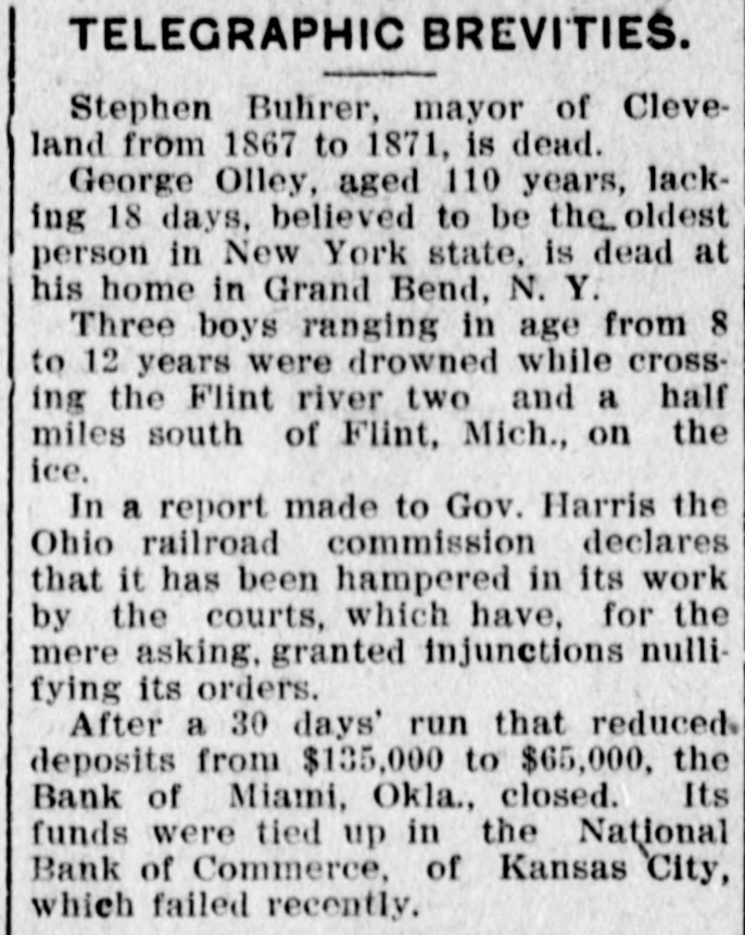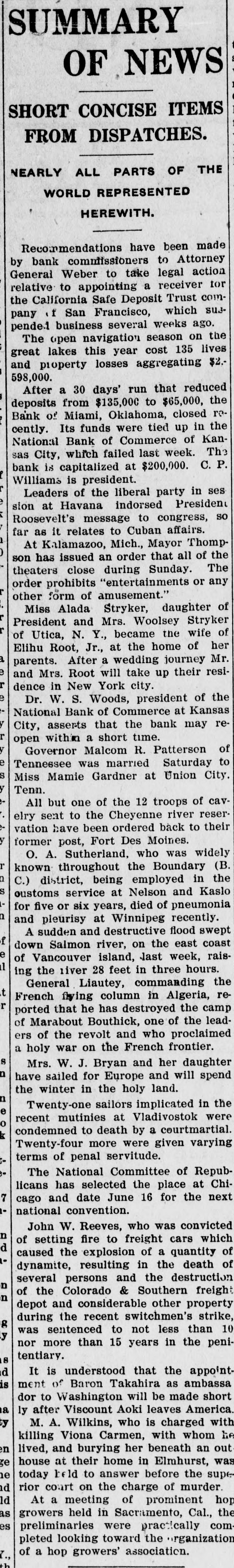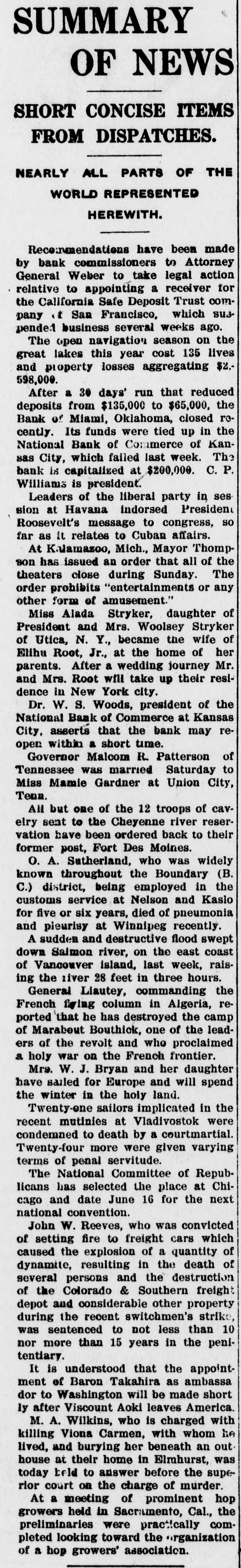 an th, NEWS OF THE WORLD eniot SHORT DISPATCHES FROM ALL es ie, PARTS OF THE GLOBE. nA Review of Happenings in Both cn Eastern and Western Hemispheres as During the Past Week-National, e, Historical, Political and Personal n Events. y $ Recommendations have been made f by bank commissioners to Attorney ZGeneral Weber to take legal action e relative to appointing a receiver for the California Safe Deposit Trust comit pany f San Francisco, which suspended business several weeks ago. h The open navigation season on the great lakes this year cost 135 lives r and pioperty losses aggregating $2.598,000. After a 30 days' run that reduced deposits from $135,000 to $65,000, the t Bank of Miami, Oklahoma, closed recently. Its funds were tied up in the National Bank of Commerce of Kansas City, which failed last week. The bank is capitalized at $200,000. C. P. Williams is president. Leaders of the liberal party in ses sion at Havana indorsed President Roosevelt's message to congress, SO far as it relates to Cuban affairs. At Kalamazoo, Mich., Mayor Thompson has issued an order that all of the theaters close during Sunday. The order prohibits "entertainments or any other form of amusement." Miss Alada Stryker, daughter of President and Mrs. Woolsey Stryker of Utica, N. Y., became the wife of Elihu Root, Jr., at the home of her parents. After a wedding journey Mr. and Mrs. Root will take up their residence in New York city. Dr. W. S. Woods, president of the National Bank of Commerce at Kansas City, asserts that the bank may reopen within a short time. Governor Malcom R. Patterson of Tennessee was married Saturday to Miss Mamie Gardner at Union City, Tenn. All but one of the 12 troops of cavelry sent to the Cheyenne river reservation have been ordered back to their former post, Fort Des Moines. O. A. Sutherland, who was widely known throughout the Boundary (B. C.) district, being employed in the customs service at Nelson and Kaslo for five or six years, died of pneumonia and pleurisy at Winnipeg recently. A sudden and destructive flood swept down Salmon river, on the east coast of Vancouver island, last week, raising the iiver 28 feet in three hours. General Liautey, commanding the French fying column in Algeria, reported that he has destroyed the camp of Marabout Bouthick, one of the leaders of the revolt and who proclaimed a holy war on the French frontier. Mrs. W. J. Bryan and her daughter have sailed for Europe and will spend the winter in the holy land. Twenty-one sailors implicated in the recent mutinies at Vladivostok were condemned to death by a courtmartial. Twenty-four more were given varying terms of penal servitude. The National Committee of Republicans has selected the place at Chicago and date June 16 for the next national convention. John W. Reeves, who was convicted of setting fire to freight cars which caused the explosion of a quantity of dynamite, resulting in the death of several persons and the destruction of the Colorado & Southern freight depot and considerable other property during the recent switchmen's strike, was sentenced to not less than 10 nor more than 15 years in the penitentiary. It is understood that the appointment of Baron Takahira as ambassa dor to Washington will be made short y after Viscount Aoki leaves America. M. A. Wilkins, who is charged with killing Viona Carmen, with whom lie lived, and burying her beneath an out house at their home in Elmhurst, was today beld to answer before the superior court on the charge of murder At a meeting of prominent hop growers held in Sacramento, Cal., the preliminaries were practically comleted looking toward the rganization f a hop growers' association.