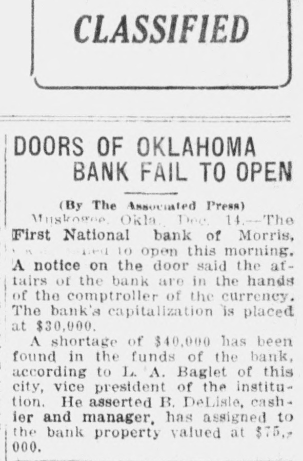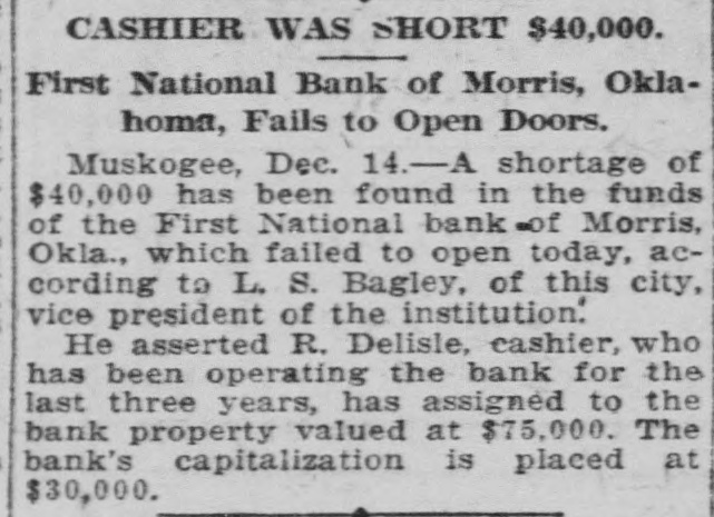 CASHIER WAS SHORT $40,000. First National Bank of Morris, Oklahoma, Fails to Open Doors. Muskogee, Dec. 14.-A shortage of $40,000 has been found in the funds of the First National bank of Morris, Okla., which failed to open today, according to L. S. Bagley, of this city, vice president of the institution. He asserted R. Delisle, cashier, who has been operating the bank for the last three years, has assigned to the bank property valued at $75,000. The bank's capitalization is placed at $30,000.