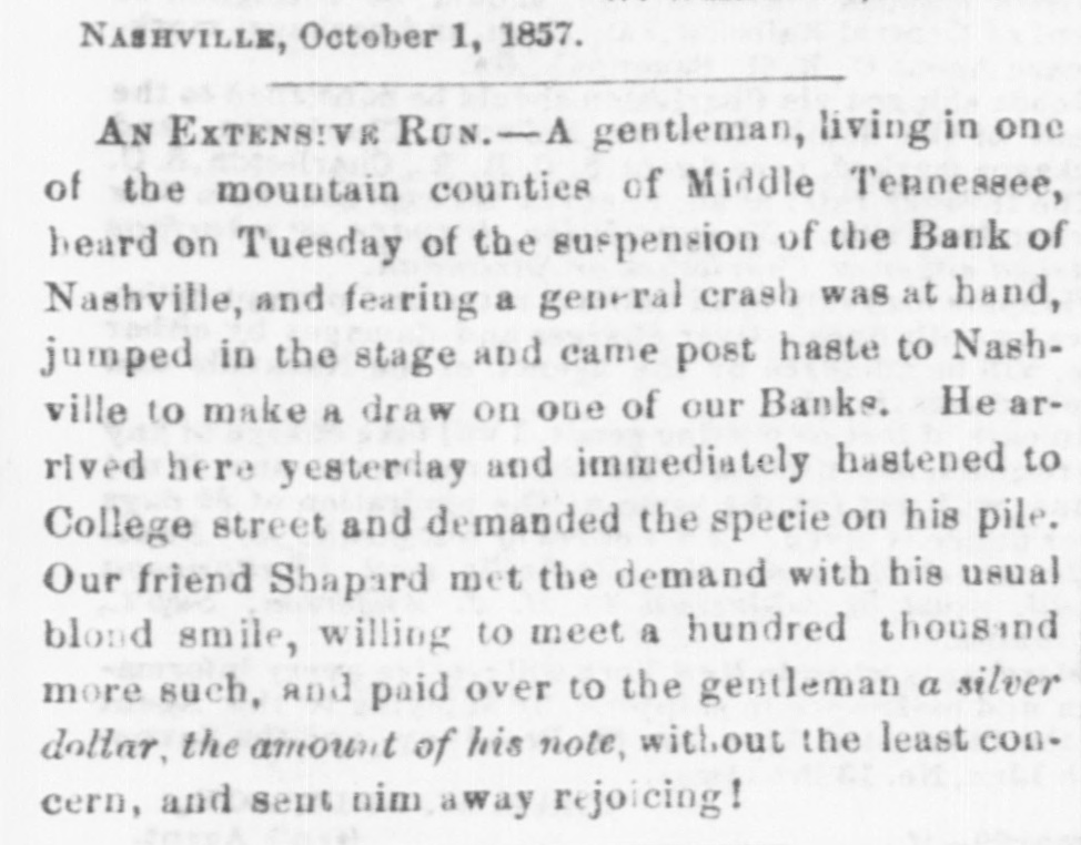 NASHVILLE, October 1, 1857. AN EXTENSIVE Ros.-A gentleman, living in one of the mountain counties of Middle Tennessee, heard on Tuesday of the suspension of the Bank of Nashville, and fearing a general crash was at hand, jumped in the stage and came post haste to Nashville to make a draw on one of our Banks. He arrived here yesterday and immediately hastened to College street and demanded the specie on his pile. Our friend Shapard met the demand with his usual blond smile, willing to meet a hundred thousand more such, and paid over to the gentleman a silver doltar, the amount of his note, without the least concern, and sent nim away rejoicing!