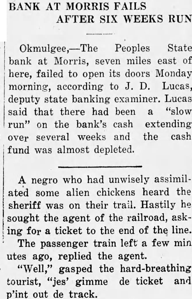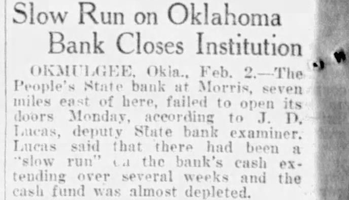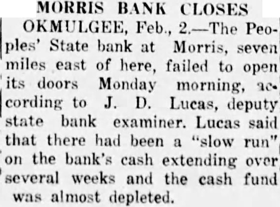 Okmulgee,-The Peoples State bank at Morris, seven miles east of here, failed to open its doors Monday morning, according to J. D. Lucas, deputy state banking examiner. Lucas said that there had been a "slow run" on the bank's cash extending over several weeks and the cash fund was almost depleted.