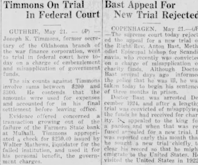 Timmons On Trial In Federal Court May GUTHRIE, May supreme court today Joseph former trial the Oklahoma branch the Bast, MethAnton corporation, went odist bishop for trial federal court charge charge of misapplication of government Although Doctor funds, counts against Timmons the ill, he between $200 today begin his sentence He contends that the for expenses Doctor Bast final and before leaving office. trial of the Evidence offered concerned ity to the king growing failure the Farmers State bank when that fused new Mulhall. Timmons appropricheck reported early this month that for for trial chiefly liquidator clear record that he might and used the United States. He personal benefit, the the United States in 1922. charges.