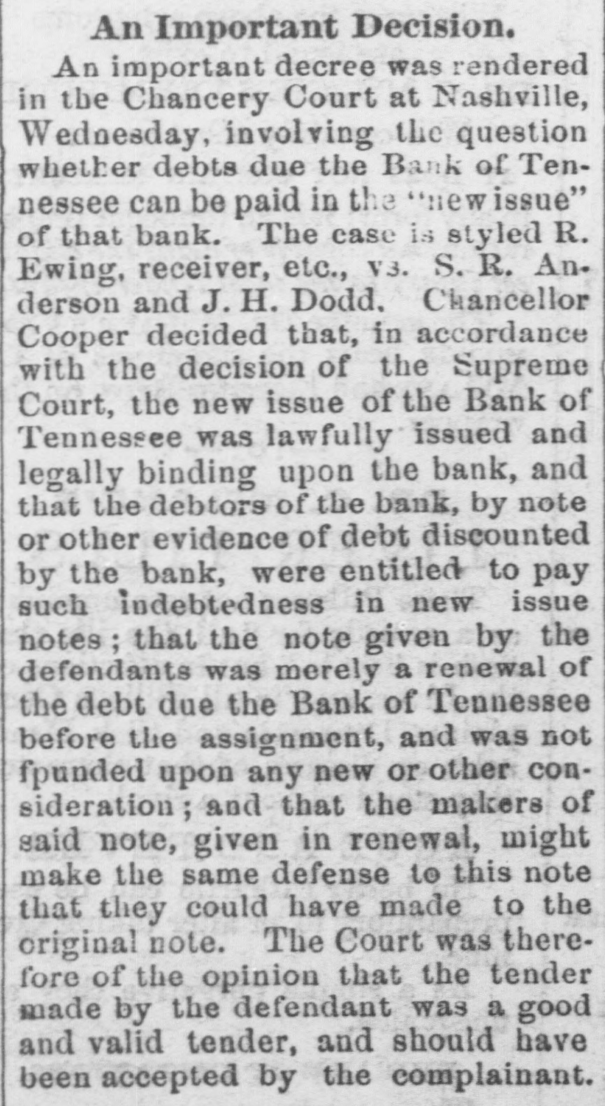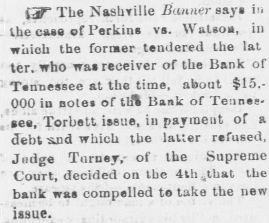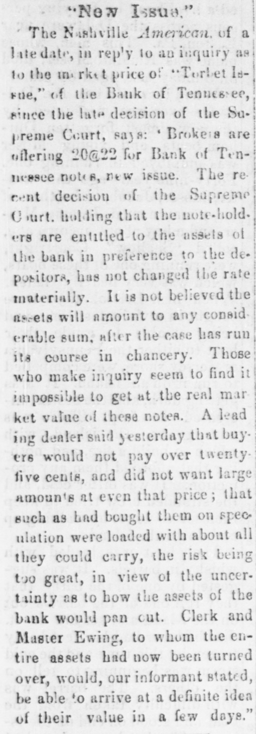 # "New Issue." The Nashville American, of a late date, in reply to an inquiry as to the market price of "Torbet Issue," of the Bank of Tennessee, since the late decision of the Supreme Court, says: * Brokers are offering 20@22 for Bank of Tennessee notes, new issue. The recent decision of the Supreme Court, holding that the note-holders are entitled to the assets of the bank in preference to the depositors, has not changed the rate materially. It is not believed the assets will amount to any considerable sum, after the case has run its course in chancery. Those who make inquiry seem to find it impossible to get at the real market value of these notes. A leading dealer said yesterday that buyers would not pay over twenty-five cents, and did not want large amounts at even that price; that such as had bought them on speculation were loaded with about all they could carry, the risk being too great, in view of the uncertainty as to how the assets of the bank would pan out. Clerk and Master Ewing, to whom the entire assets had now been turned over, would, our informant stated, be able to arrive at a definite idea of their value in a few days."