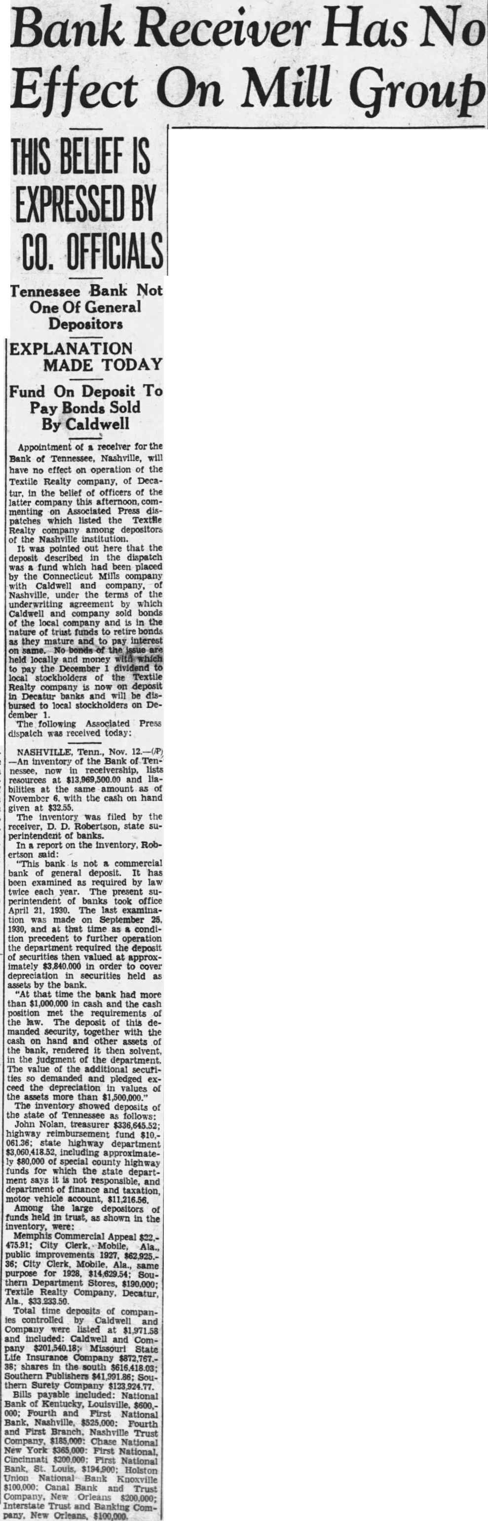 Appointment of receiver the Bank of Tennessee, Nashville, will have no effect on operation of the Textile Realty of Decacompany, tur. in the belief of officers of the latter company this afternoon, menting on Associated Press patches which listed the Textile Realty company among depositors the Nashville institution. It was pointed out here that the deposit described in the dispatch fund which had been placed by the Connecticut Mills company with Caldwell company, Nashville, under the terms the underwriting agreement which Caldwell company bonds of the local company and in the nature of trust funds to retire bonds they mature and to pay interest as bonds held locally and money to the December dividend pay local stockholders the Textile Realty now on deposit company in Decatur banks and be disbursed to local stockholders on DeThe following Associated Press dispatch was received today: