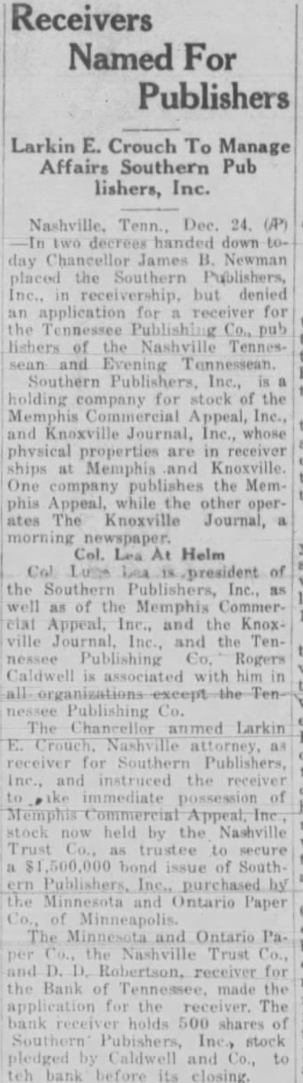Nashville, Tenn. Dec. 24. (AP) two decrees handed down today Chancellor James B. Newman placed the Southern Publishers, Inc., in receivership, but denied an application for receiver for the Tennessee Publishing Co., pub lishers of the Nashville Tennessean and Evening Tennessean. Southern Publishers, Inc. is holding company for stock of the Memphis Appeal, Inc., and Knoxville Journal, Inc. whose physical properties are in receiver ships at Memphis and Knoxville One company publishes the Memphis Appeal, while the other operates The Knoxville Journal, morning newspaper. Col. Lea At Helm the Southern Publishers, Inc., as well as of the Memphis Commerclai Appeal, Inc., and the Knoxville Journal, Inc., and the Tennessee Publishing Rogers Caldwell is associated with him in except nessee Publishing Co. The Chancellor anmed Larkin E. Crouch. Nashville attorney as receiver for Southern Publishers, and instruced the receiver immediate of stock now held by the Nashville Trust trustee to secure bond issue of South ern Publishers, Inc., purchased by the Minnesota and Ontario Paper of Minneapolis. The Minnesota and Ontario PaNashville Trust and D. Robertson, receiver for the Bank of Tennessee, made the application for the receiver. The bank holds 500 shares of Southern Pubishers, Inc., stock pledged by Caldwell and Co., to teh bank before its closing.