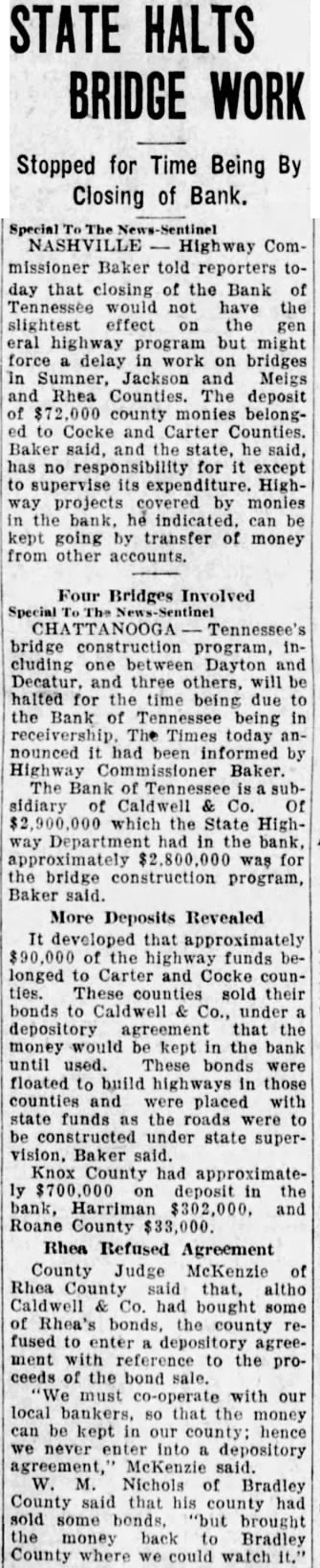 More Deposits Revealed It developed that approximately $90,000 of the highway funds belonged to Carter and Cocke counties. These sold their bonds to Caldwell & Co., under depository agreement that the money would be kept in the bank until used. These bonds were floated build highways in those counties and were placed with state funds as the roads to be constructed under state supervision. Baker Knox County had approximately $700 deposit in the bank, Harriman $302,000. and Roane County $33,000. Rhea Refused Agreement County Judge McKenzie of Rhea County said that, altho Caldwell & Co. had bought some of Rhea's bonds, the county refused to enter depository agreement with reference to the proceeds of the bond sale. must co-operate with our local bankers, 80 that the money can be kept in our county: hence we never enter into depository agreement, McKenzie W. M. Nichols of Bradley County said that his county had sold some brought the money back Bradley County where we could watch it."