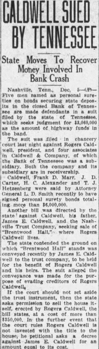 Nashville, Tenn., Dec. 5-(P)Five men named as personal sureties on bonds securing state deposits in the closed Bank of Tennesare made defendants suit filed the state Tennessee, which seeks for $3,060,000 as the amount of highway funds in the band. The was filed in chancery court last night against Rogers Caldand four Caldwell of which the Bank of subsidiary. Both the company and its subsidiary Caldwell, Frank D. Marr. D. Carter, H. and Hetzenberg said by Attorney General Smith have signed surety bonds totalmore than Another bill was directed by the state his father. James Caldwell. the Nash. ville Trust Company, seeking sale of "Brentwood Hall,"- where Rogers Caldwell The state the ground on which "Brentwood Hall" stands recently by James E. Caldwell to the trust company, to be held for the benefit Rogers Caldwell and his heirs. The suit alleged the conveyance made for purpose evading creditors of Rogers Caldwell, If the court should not set aside the trust instrument, then the state permission sell house it. erected by Rogers Caldwell, the states, cost more than $350,000. In the further event the court Rogers Caldwell with the to the house, he petitional decree against James Caldwell for an amount equal to its cost.