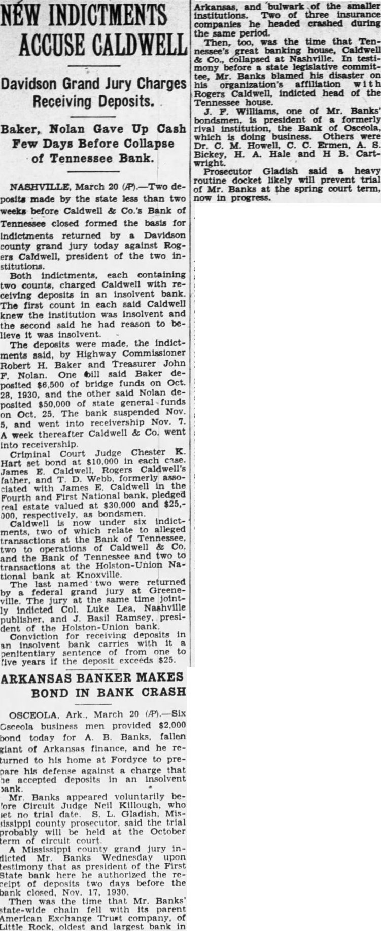 Arkansas, and 'bulwark of the smaller institutions. Two of three insurance companies he headed crashed during the same period. Then, too, was the time that Tennessee's great banking house, Caldwell & Co., collapsed at Nashville. In testimony before state commitMr. Banks blamed his disaster affiliation Rogers Caldwell, indicted head of the Tennessee house. Williams, one of Mr. Banks' bondsmen. is president of formerly rival institution, the Bank of Osceola, which is doing Others M. C. Ermen, Bickey, H. A. Hale and H B. Cartwright. Prosecutor Gladish said heavy routine docket likely will trial of Mr. Banks at the spring court term, now in progress.