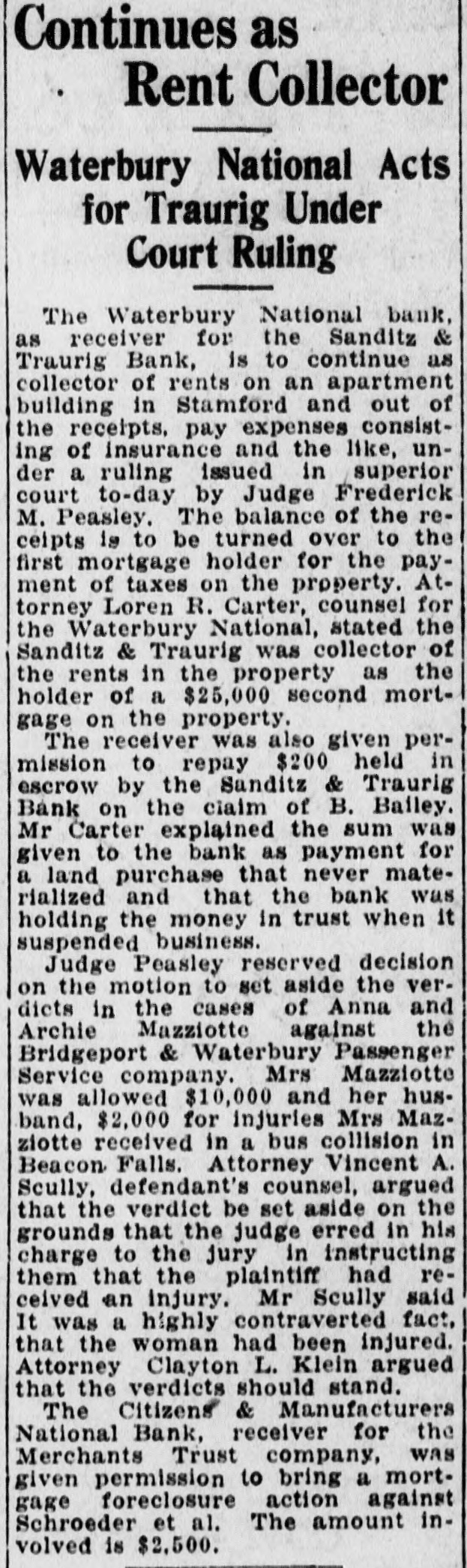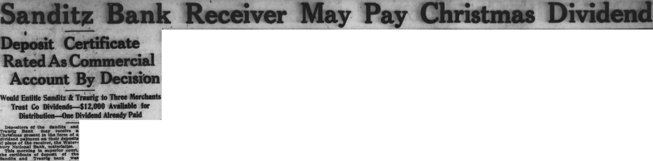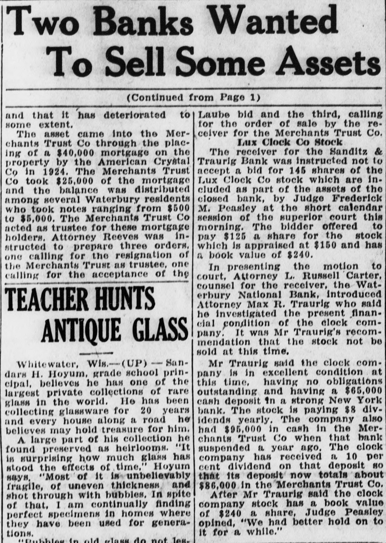 Two Banks Wanted To Sell Some Assets (Continued from Page 1) and that it has deteriorated to Laube bid and the third, calling some extent. for the order of sale by the receiver for the Merchants Trust Co. The asset came into the MerLux Clock Co Stock chants Trust Co through the placThe receiver for the Sanditz & ing of a $40,000 mortgage on the Traurig Bank was instructed not to property by the American Crystal accept a bid for 145 shares of the Co in 1924. The Merchants Trust Lux Clock Co stock which are inCo took $25,000 of the mortgage cluded as part of the assets of the and the balance was distributed closed bank, by Judge Frederick among several Waterbury residents M. Peasley at the short calendar who took notes ranging from $500 session of the superior court this to $5,000. The Merchants Trust Co morning. The bidder offered to acted as trustee for these mortgage pay $125 a share for the stock holders. Attorney Reeves was inwhich is appraised at $150 and has structed to prepare three orders. a book value of $240. one calling for the resignation of the Merchants Trust as trustee, one In presenting the motion to calling for the acceptance of the court, Attorney L. Russell Carter, counsel for the receiver, the Waterbury National Bank, introduced Attorney Max R. Traurig who said TEACHER HUNTS he investigated the present financial condition of the clock company. It was Mr Traurig's recommendation that the stock not be ANTIQUE GLASS sold at this time. Mr Traurig said the clock comWhitewater, Wis.-(UP) - Sanpany is in excellent condition at dars H. Hoyum, grade school printhis time, having no obligations cipal, believes he has one of the outstanding and having a $65,000 largest private collections of rare cash deposit In a strong New York glass in the world. He has been bank. The stock is paying $8 divcollecting glassware for 20 years idends yearly. The company also and every house along a road he had $95,000 in cash in the Merbelieves may hold treasure for him. chants Trust Co when that bank A. large part of his collection he suspended a year ago. The clock found preserved as heirlooms. "It company has received a 10 per in surprising how much glass has cent dividend on that deposit 80 stood the effects of time." Hoyum that its deposit now totals about says, "Most of it is unbelievably $86,000 in the Merchants Trust Co. fragile, of uneven thickness and After Mr Traurig said the clock shot through with bubbles. In spite company stock has a book value of that, I am continually finding of $240 a share, Judge Peasley perfect specimens in homes where opined, "We had better hold on to they have been used for generait for a while." tions. do les. not in class