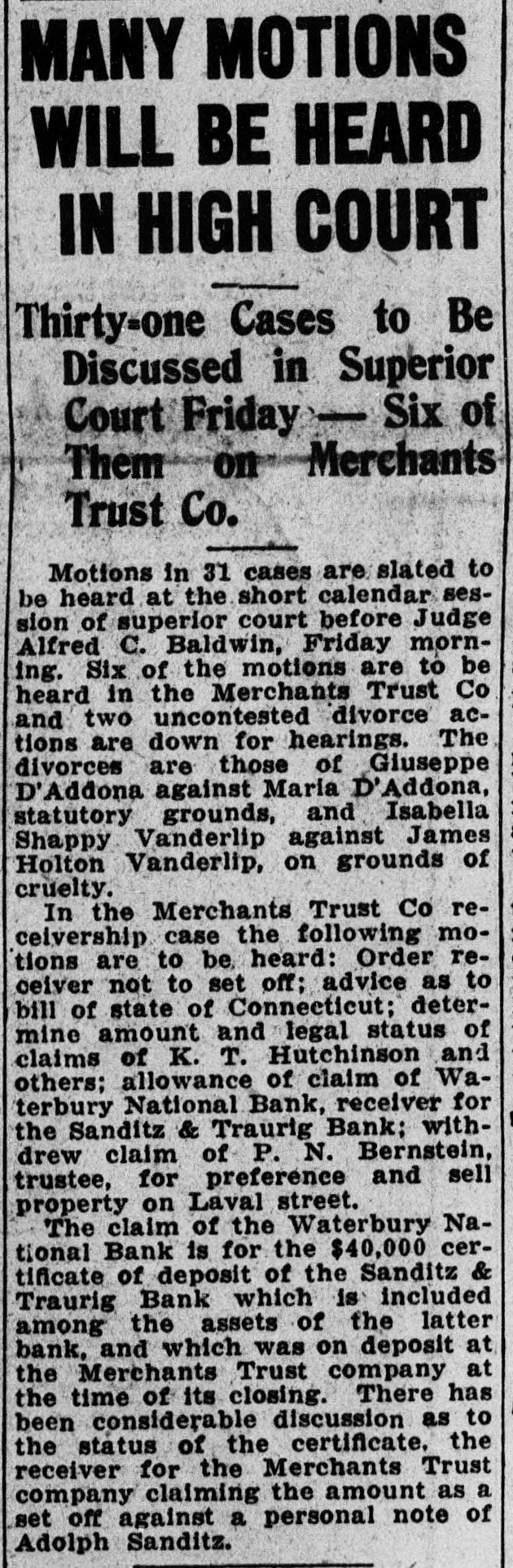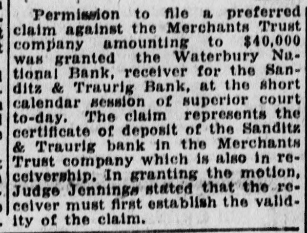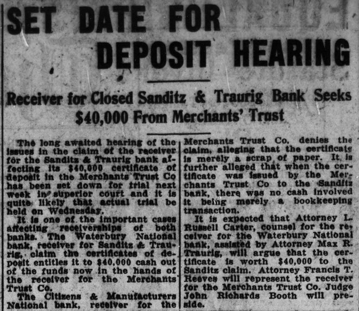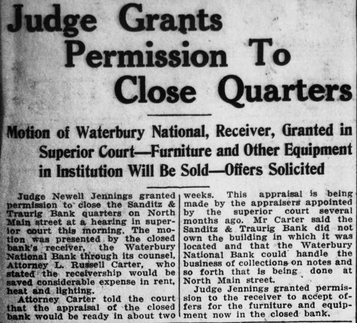 Two Banks Wanted To Sell Some Assets (Continued from Page 1) and that it has deteriorated to Laube bid and the third, calling some extent. for the order of sale by the receiver for the Merchants Trust Co. The asset came into the MerLux Clock Co Stock chants Trust Co through the placThe receiver for the Sanditz & ing of a $40,000 mortgage on the Traurig Bank was instructed not to property by the American Crystal accept a bid for 145 shares of the Co in 1924. The Merchants Trust Lux Clock Co stock which are inCo took $25,000 of the mortgage cluded as part of the assets of the and the balance was distributed closed bank, by Judge Frederick among several Waterbury residents M. Peasley at the short calendar who took notes ranging from $500 session of the superior court this to $5,000. The Merchants Trust Co morning. The bidder offered to acted as trustee for these mortgage pay $125 a share for the stock holders. Attorney Reeves was inwhich is appraised at $150 and has structed to prepare three orders. a book value of $240. one calling for the resignation of the Merchants Trust as trustee, one In presenting the motion to calling for the acceptance of the court, Attorney L. Russell Carter, counsel for the receiver, the Waterbury National Bank, introduced Attorney Max R. Traurig who said TEACHER HUNTS he investigated the present financial condition of the clock company. It was Mr Traurig's recommendation that the stock not be ANTIQUE GLASS sold at this time. Mr Traurig said the clock comWhitewater, Wis.-(UP) - Sanpany is in excellent condition at dars H. Hoyum, grade school printhis time, having no obligations cipal, believes he has one of the outstanding and having a $65,000 largest private collections of rare cash deposit In a strong New York glass in the world. He has been bank. The stock is paying $8 divcollecting glassware for 20 years idends yearly. The company also and every house along a road he had $95,000 in cash in the Merbelieves may hold treasure for him. chants Trust Co when that bank A. large part of his collection he suspended a year ago. The clock found preserved as heirlooms. "It company has received a 10 per in surprising how much glass has cent dividend on that deposit 80 stood the effects of time." Hoyum that its deposit now totals about says, "Most of it is unbelievably $86,000 in the Merchants Trust Co. fragile, of uneven thickness and After Mr Traurig said the clock shot through with bubbles. In spite company stock has a book value of that, I am continually finding of $240 a share, Judge Peasley perfect specimens in homes where opined, "We had better hold on to they have been used for generait for a while." tions. do les. not in class