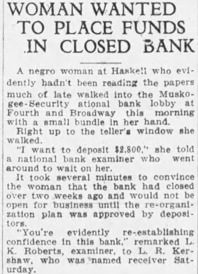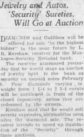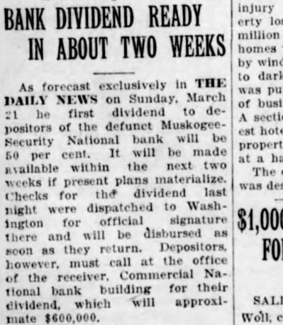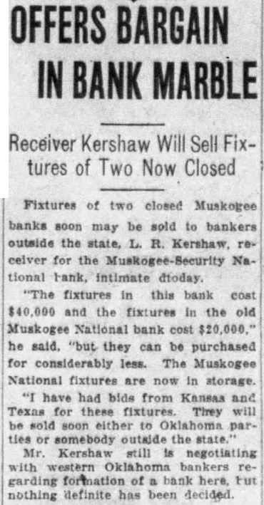 "Sale of the McKibban building make about $45,500 more in cash available for the receivership of the National bank,' L. R. Kershaw last night in announcing the sale of the two-story brick structure just north of the Muskogee National bank building to Warner. The property. which secured certain notes held by the "Security, was sold by former officials of the Muskogee National bank. The proceeds will be used in paying the guarantees of these officers on the notes held by the Sale of the McKibban structure seen both as an evidence of confidence in Muskogee's future on the part of Mr. Warner and an attempt to liquidate the assets of the closed bank as rapidly as possible. Receipts of the proceeds by the receivership will bring the total assets collected to well over $600,000. It is understood. and probably increase the size of the dividend promised depositors by Comptroller McIntosh in the near future.