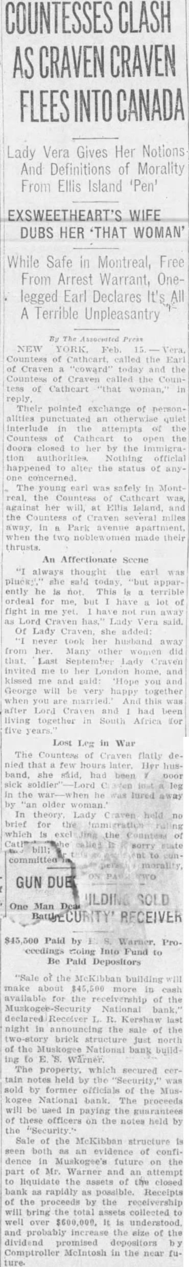 By The Associated Press Countess of Catheart, called the Earl of Craven "coward" today and the Countess of Craven called the Countess of Catheart "that woman, in reply Their pointed exchange of personalities an quiet interlude in the attempts of the Countess of Catheart to open the doors closed to her by the Immigra tion authorities. Nothing official happened to alter the status of anyone The young earl was safely In Mont real. the Countess Catheart against her will, at Ellis Island, and the of miles away, in Park avenue apartment, when the two noblewomen made their thrusts.