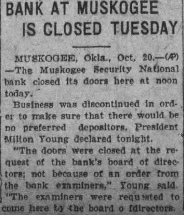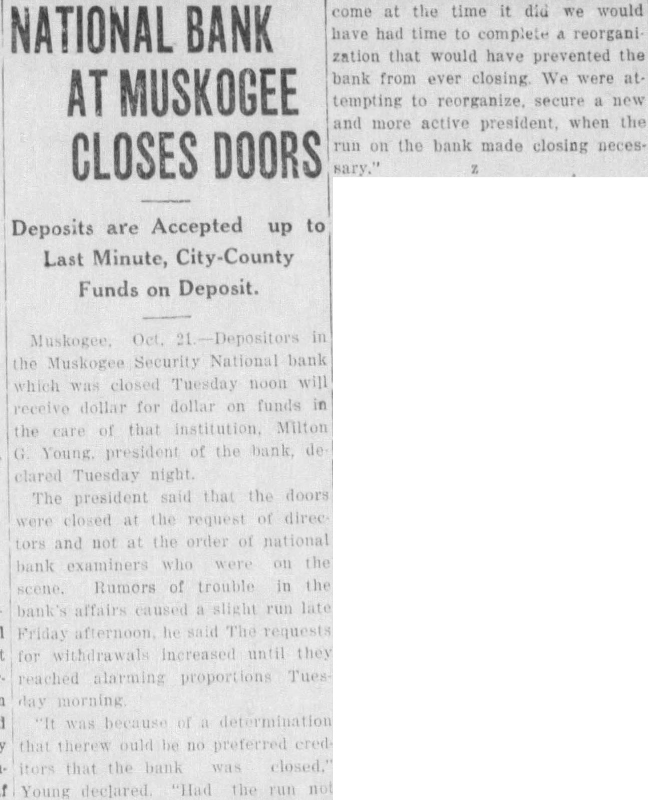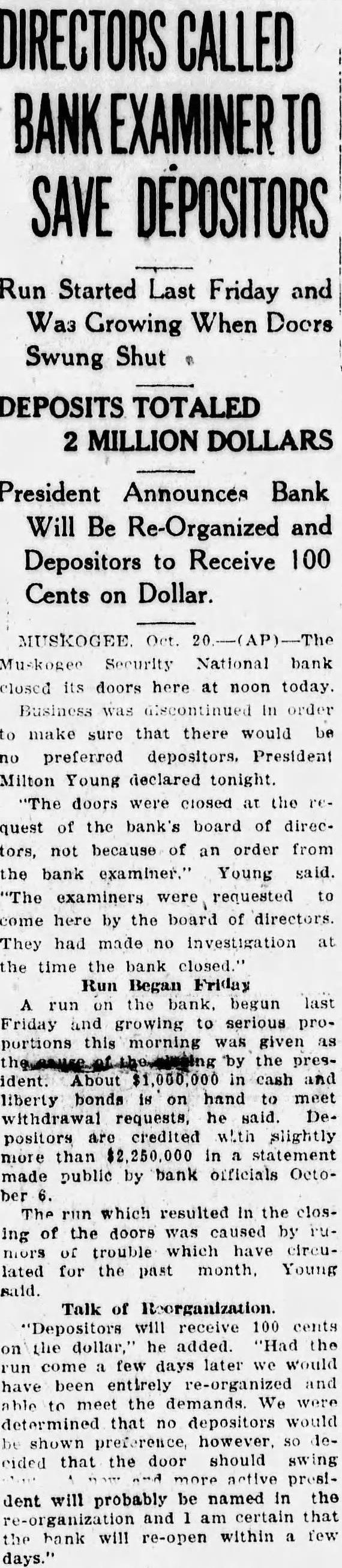 MUSKOGEE Oct. 20 Muskogee Security National bank closed its doors here at noon today. Business was discontinued In order to make sure that there would be no preferred depositors. President Milton Young declared tonight. "The doors were closed at the request of the bank's board of directors, not because of an order from the bank examiner." Young said. "The examiners were requested to come here by the board of directors. They had made no investigation at the time the bank closed." Run Began Friday A run on the bank. begun last Friday and growing to serious proportions this morning was given as by the president. About $1,000,000 in cash and liberty bonds 18 on hand to meet withdrawal requests, he said. Depositors are credited with slightly more than $2,250,000 in statement made public by bank officials October 6. The run which resulted In the closing of the doors was caused by rumors of trouble which have circulated for the past month. Young said.