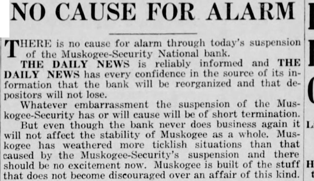 NO CAUSE FOR ALARM is no cause for alarm through today's suspension of the Muskogee-Security National bank. THE DAILY NEWS is reliably informed and THE DAILY NEWS has every confidence in the source of its information that the bank will be reorganized and that depositors will not lose. Whatever embarrassment the suspension of the Muskogee-Security has or will cause will be of short termination. the bank never does business again it But even though will not affect the stability of Muskogee as a whole. Muskogee has weathered more ticklish situations than that caused by the Muskogee-Security's suspension and there should be no excitement now. Muskogee is built of the stuff that does not become discouraged over an affair of this kind.