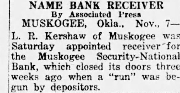 NAME BANK RECEIVER Associated Press MUSKOGEE, Okla., Nov., 7L R. Kershaw of Muskogee was Saturday appointed receiver for the Muskogee Security-National Bank, which closed its doors three weeks ago when a "run" was begun by depositors.