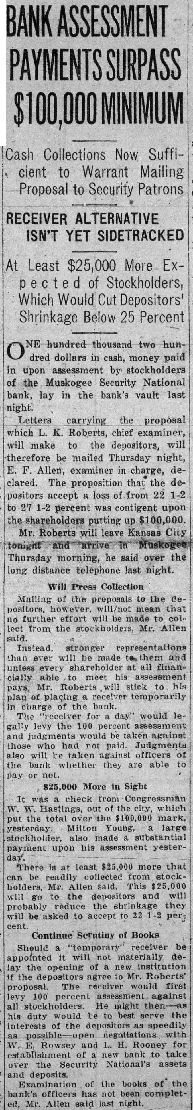 At Least $25,000 of Stockholders, Which Would Cut Depositors' Shrinkage Below 25 Percent hundred dollars in cash, money paid in upon assessment by stockholders of the Muskogee Security National bank, lay in the bank's vault last night. Letters carrying the proposal which L. K. Roberts, chief examiner, will make to the depositors, will therefore be mailed Thursday night, E. Allen, examiner in charge, declared. The proposition that the depositors accept loss of from 22 1-2 to 27 1-2 percent was contigent upon the shareholders putting up $100,000. Mr. Roberts will leave Kansas City Thursday morning, he said over the long distance telephone last night.