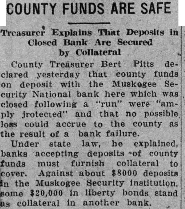 County Treasurer Bert Pitts declared yesterday that county funds on deposit with the Muskogee Security National bank here which was closed following were "amply frotected' and that no possible loss could to the county as the result of bank failure. Under state law, he explained, banks accepting deposits of county funds must furnish collateral to Against about $8000 deposits the Muskogee Security institution, some $20,000 liberty bonds stand collateral in another bank.
