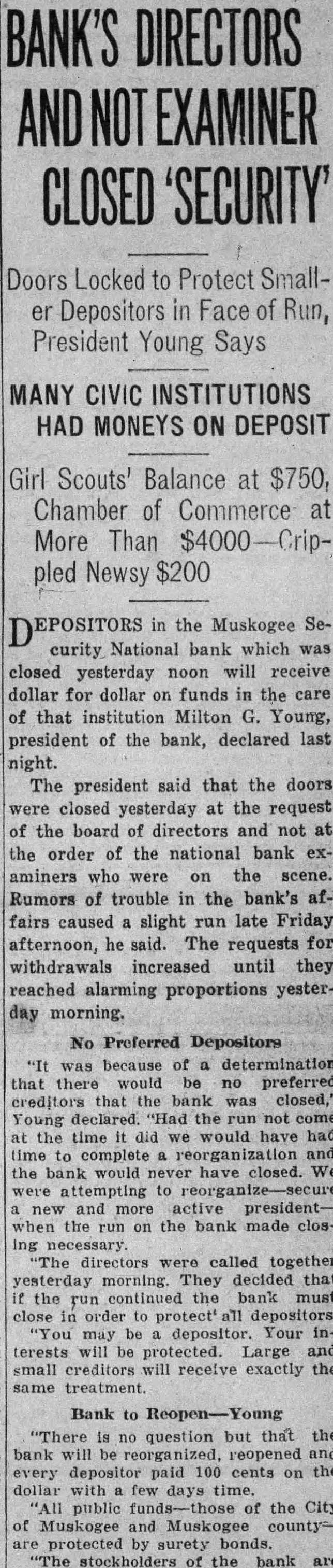 Girl Scouts' Balance at $750, Chamber of Commerce at More Than pled Newsy $200 in the Muskogee Security National bank which was closed yesterday noon will receive dollar for dollar on funds in the care of that institution Milton G. Young, president of the bank, declared last night. The president said that the doors were closed yesterday at the request of the board of directors and not at the order of the national bank examiners who were on the scene. Rumors of trouble in the bank's affairs caused slight run late Friday afternoon, he said. The requests for withdrawals increased until they reached alarming proportions yesterday morning.