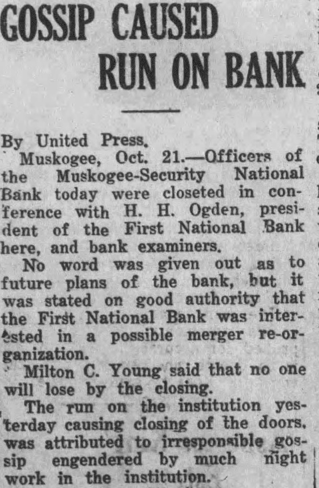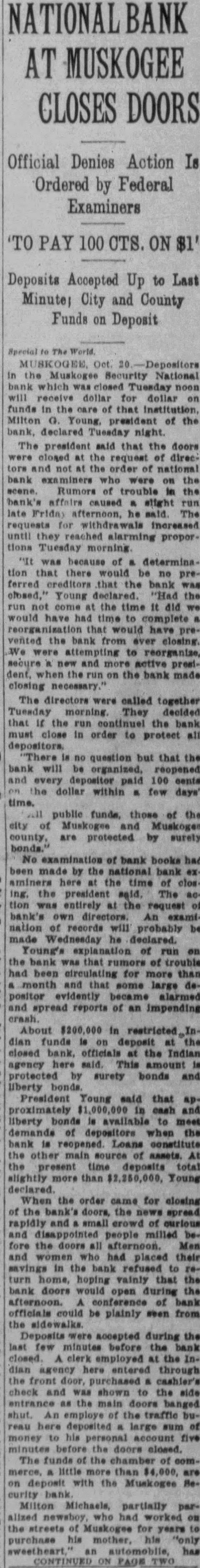 Deposits Accepted Up to Last Minute; City and County Funds on Deposit the Muskogee Security National bank which Tuesday will receive dollar dollar funds in the that institution, Milton Young of the bank, declared night. The president said that the doors closed the request direcand not the order of national bank examiners who were the Rumors trouble the bank's affairs caused run Friday afternoon, he The requests until they reached alarming proportions Tuesday morning was because of determination that there would be ferred that the bank was closed,' Young declared. "Had the not come the time did would have had time to complete would have prevented the bank from ever closing. were attempting to reorganize, secure new and more active presiwhen the run the bank made closing necessary.' The directors were called together Tuesday morning. They decided that the the bank must close order to protect all question but that the bank will be reopened and every paid 100 the dollar within few days' time. public funds, those of the city of Muskogee Muskoges are protected by surely bonds." No examination of bank books been made by the national bank aminers here the time of closing. president The tion entirely the request bank's examination records will probably be made Wednesday he declared. Young's of run bank that trouble been for more than month and some large depositor evidently alarmed and spread reports of an impending crash About in dian funds deposit closed bank, officials the Indian agency here said. This amount protected surety bonds and liberty President Young said that proximately liberty bonds available meet demands of depositors when the bank reopened Loans constitute other main source of the present time deposits total more than Young When the order came for closing the the rapidly and small people milled fore the doors afternoon. and placed their savings in the bank refused home, hoping vainly that the bank doors would open during the afternoon. conference of bank officials could be plainly seen from the Deposits were accepted during the few minutes before the closed clerk employed the dian agency here entered through the front door, cashier's check and was shown the entrance the main doors banged shut employe the traffic here deposited large of money his account five the doors closed. The funds the of little more than deposit with the Muskogee Becurity Milton Michaels, partially paralized worked on the streets Muskogee for purchase his his "only automobile, has