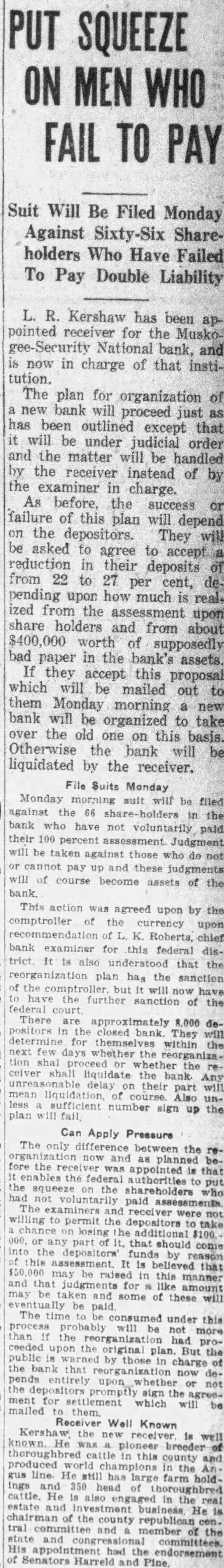 L. R. Kershaw has been appointed receiver for the Muskogee-Security National bank, and is now in charge of that institution. The plan for organization of a new bank will proceed just as has been outlined except that it will be under judicial order and the matter will be handled by the receiver instead of by the examiner in charge. As before, the success or failure of this plan will depend on the depositors. They will be asked to agree to accept. reduction in their deposits of from 22 to 27 per cent, depending upon how much is realized from the assessment upon share holders and from about $400,000 worth of supposedly bad paper in the bank's assets. If they accept this proposal which will be mailed out to them Monday morning a new bank will be organized to take over the old one on this basis. Otherwise the bank will be liquidated by the receiver.