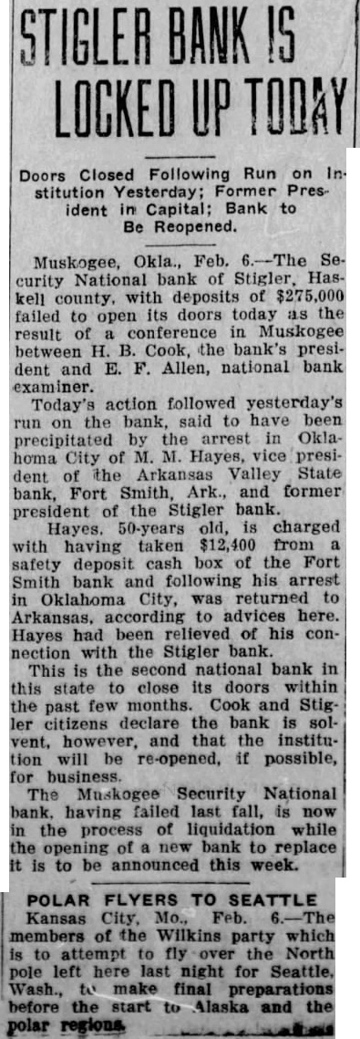 Muskogee, Okla., Feb. National bank of Hascurity kell deposits of $275,000 failed its doors today as the to open result of in Muskogee between Cook, the bank's president E. Allen, national bank examiner. Today's action followed yesterday's the bank, said to have been run by the arrest in Oklaprecipitated homa City of Hayes, vice president the Arkansas Valley State Fort Smith, Ark., and former bank, president of the Stigler bank. Hayes. 50-years charged with having taken from safety deposit box of the Fort Smith bank and following his arrest Oklahoma City, was returned to according to advices here. Hayes had been relieved of his connection with the Stigler bank. This the national bank in state to close its doors within the past few months. Cook and Stigler citizens declare the bank vent, and the institution will be re-opened, if possible, business. The Muskogee Security National bank. having failed last fall, now the process of liquidation while the opening bank to replace to be announced this week.