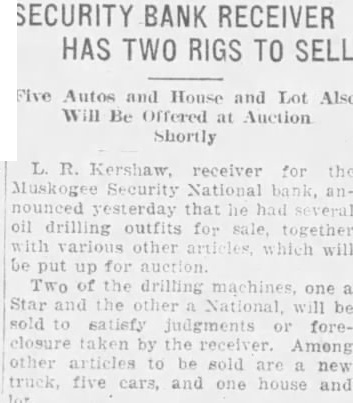L. R. Kershaw, receiver for the Muskogee Security National bank, announced yesterday that he had several oil drilling outfits for sale, together with various other arti which will be put up for auction. Two of the drilling machines, one Star and the other National, will be sold to satisfy judgments or foreclosure taken by the receiver. Among other articles to be sold are new truck, five cars, and one house and lot.