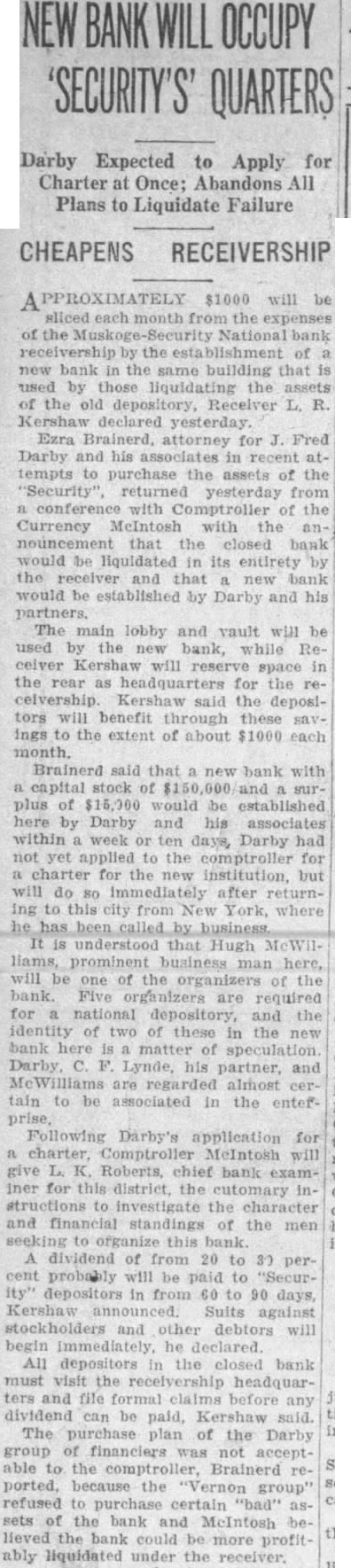 A PPROXIMATELY $1000 will be sliced each month from the expenses of the Muskoge-Security National bank receivership by the establishment of new bank in the same building that is used by those liquidating the assets of the old depository, Receiver L. R. Kershaw declared yesterday. Ezra Brainerd, attorney for J. Fred Darby and his associates in recent attempts to purchase the assets of the "Security" returned yesterday from a conference with Comptroller of the Currency MeIntosh with the announcement that the closed bank would be liquidated in its entirety by the and that new bank would be established by Darby and his partners. The main lobby and vault will be used by the new bank, while Receiver Kershaw will reserve space in the rear as headquarters for the receivership. Kershaw said the depositors will benefit through these savings to the extent of about $1000 each month. Brainerd said that a new bank with a capital stock of $150,000 and surplus of $15,000 would be established here by Darby and his associates within a week or ten days, Darby had not yet applied to the comptroller for a charter for the new institution, but will do so immediately after returning to this city from New York, where he has business. It is understood that Hugh MeWilHams, prominent business man here, will be one of the organizers of the bank. Five organizers are required for a national depository, and the identity of two of these in the new bank here is a matter of speculation Darby C. F. Lynde, his partner, and McWilliams are regarded almost certain to be associated in the enterFollowing Darby's application for a charter, Comptroller MeIntosh will give L. K. Roberts, chief bank examiner for this district, the cutomary instructions to investigate the character and financial standings of the men seeking to organize this bank A dividend of from 20 to 30 percent probably will be paid to "Security" depositors in from 60 to 90 days, Kershaw announced. Suits against stockholders and other debtors will begin immediately, he declared. All depositors in the closed bank must visit the receivership headquarters and file formal claims before any dividend can be paid, Kershaw said. The purchase plan of the Darby group of financiers was not acceptable to the comptroller, Brainerd reported, because the "Vernon group" refused to purchase certain "bad" assets of the bank and McIntosh believed the bank could be more profit ably liquidated under the receiver.