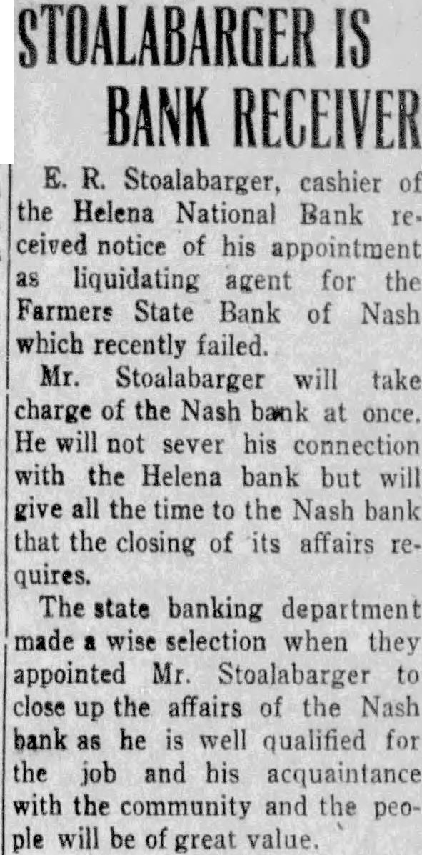 STOALABARGER IS BANK RECEIVER E. R. Stoalabarger, cashier of the Helena National Bank received notice of his appointment as liquidating agent for the Farmers State Bank of Nash which recently failed. Mr. Stoalabarger will take charge of the Nash bank at once. He will not sever his connection with the Helena bank but will give all the time to the Nash bank that the closing of its affairs requires. The state banking department made a wise selection when they appointed Mr. Stoalabarger to close up the affairs of the Nash bank as he is well qualified for the job and his acquaintance with the community and the people will be of great value.