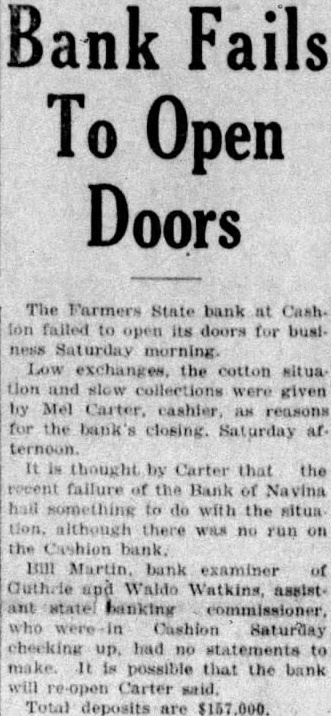 Bank Fails To Open Doors The Farmers State bank at Cashton failed to open its doors for business Saturday morning Low exchanges, the cotton situa Uon and slow were given by Mel Carter, cashier, as reasons for the bank's closing. Saturday at It is thought by Carter that the recent failure of the Bank of Navina something to do with the situa tion, although there WILS no run on the Cashion bank. Bill Martin. bank examiner of ant state! banking commissioner, Cashion Saturday checking up, had no statements to make It is possible that the bank will re-open Carter said Total deposits are