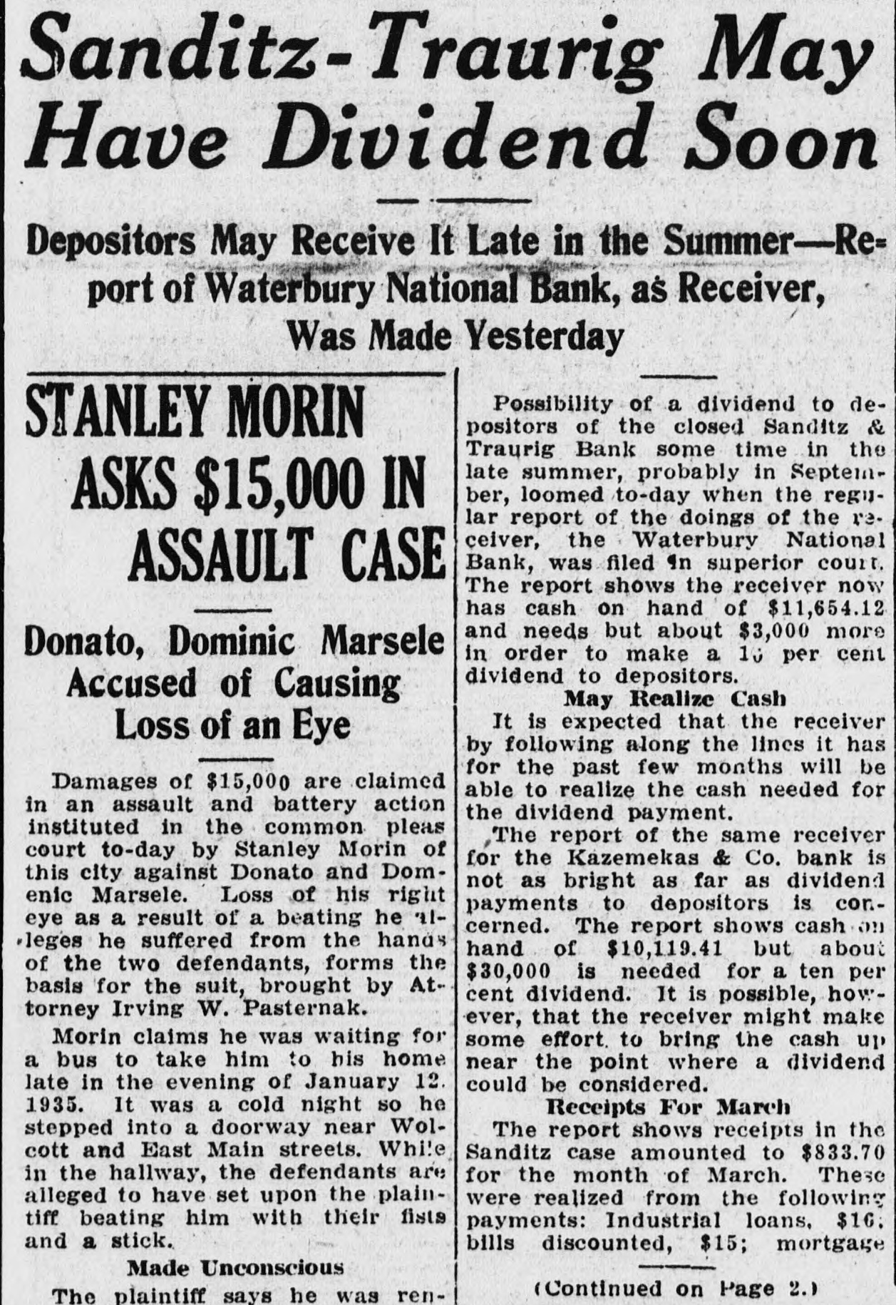 Sanditz- Traurig May Have Dividend Soon Depositors May Receive It Late in the Summer-Re= port of Waterbury National Bank, as Receiver, Was Made Yesterday Possibility of a dividend to depositors of the closed Sanditz & STANLEY MORIN Traurig Bank some time in the late summer, probably in September, loomed to-day when the reguASKS $15,000 IN lar report of the doings of the receiver, the Waterbury National Bank, was filed In superior court. ASSAULT CASE The report shows the receiver now has cash on hand of $11,654.12 and needs but about $3,000 more Donato, Dominic Marsele in order to make a 10 per cent dividend to depositors. Accused of Causing May Realize Cash It is expected that the receiver Loss of an Eye by following along the lines it has for the past few months will be Damages of $15,000 are claimed able to realize the cash needed for in an assault and battery action the dividend payment. instituted in the common pleas The report of the same receiver court to-day by Stanley Morin of for the Kazemekas & Co. bank is this city against Donato and Domnot as bright as far as dividend enic Marsele. Loss of his right payments to depositors is coneye as a result of a beating he 11cerned. The report shows cash on leges he suffered from the hands hand of $10,119.41 but about of the two defendants, forms the $30,000 is needed for a ten per basis for the suit, brought by Atcent dividend. It is possible, howtorney Irving W. Pasternak. ever, that the receiver might make Morin claims he was waiting for some effort. to bring the cash up a bus to take him to his home near the point where a dividend late in the evening of January 12. could be considered. 1935. It was a cold night so he Receipts For March stepped into a doorway near WolThe report shows receipts in the cott and East Main streets. While Sanditz case amounted to $833.70 in the hallway, the defendants are for the month of March. These alleged to have set upon the plainwere realized from the following tiff beating him with their fists payments: Industrial loans, $16. and a stick. bills discounted, $15; mortgage Made Unconscious (Continued on Page 2.) The plaintiff says he was ren-