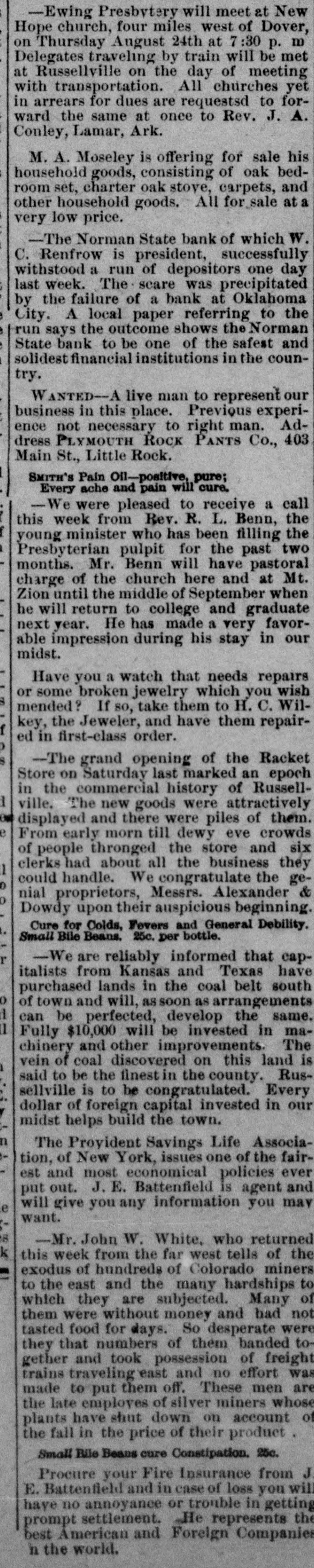 -Ewing Presbytery will meet at New Hope church, four miles west of Dover, on Thursday August 24th at 7:30 p. m Delegates traveling by train will be met at Russellville on the day of meeting with transportation. All churches yet in arrears for dues are requestsd to forward the same at once to Rev. J. A. Conley, Lamar, Ark. M. A. Moseley is offering for sale his household goods, consisting of oak bedroom set, charter oak stove, carpets, and other household goods. All for sale at a very low price. -The Norman State bank of which W. C. Renfrow is president, successfully withstood a run of depositors one day last week. The scare was precipitated by the failure of a bank at Oklahoma City. A local paper referring to the run says the outcome shows the Norman State bank to be one of the safest and solidest financial institutions in the country. WANTED-A live man to represent our business in this place. Previous experience not necessary to right man. Address PLYMOUTH ROCK PANTS Co., 403 Main St., Little Rock. SMITH'S Pain Oll-positive, pure; Every ache and pain will cure. -We were pleased to receive a call this week from Rev. R. L. Benn, the young minister who has been filling the Presbyterian pulpit for the past two months. Mr. Benn will have pastoral charge of the church here and at Mt. Zion until the middle of September when he will return to college and graduate next year. He has made a very favorable impression during his stay in our midst. Have you a watch that needs repairs or some broken jewelry which you wish mended? If so, take them to H. C. Wilkey, the Jeweler, and have them repairf ed in first-class order. b S -The grand opening of the Racket Store on Saturday last marked an epoch in the commercial history of RussellI ville. The new goods were attractively displayed and there were piles of them. e From early morn till dewy eve crowds of people thronged the store and six clerks had about all the business they 1 could handle. We congratulate the ge0 nial proprietors, Messrs. Alexander & 0 Dowdy upon their auspicious beginning. Cure for Colds, Fevers and General Debility. 1. Small Bile Beans. 25c. per bottle. r -We are reliably informed that capitalists from Kansas and Texas have purchased lands in the coal belt south 0 of town and will, ssoon as arrangements d can be perfected, develop the same. 11 Fully $10,000 will be invested in machinery and other improvements. The vein of coal discovered on this land is said to be the finest in the county. Russellville is to be congratulated. Every dollar of foreign capital invested in our midst helps build the town. n The Provident Savings Life Association, of New York, issues one of the fairest and most economical policies ever put out. J. E. Battenfield is agent and will give you any information you may e want. :8 -Mr. John W. White, who returned k this week from the far west tells of the exodus of hundreds of Colorado miners to the east and the many hardships to which they are subjected. Many of them were without money and had not tasted food for days. So desperate were they that numbers of them banded to gether and took possession of freight trains traveling east and no effort was made to put them off. These men are the late employes of silver miners whose plants have shut down on account o the fall in the price of their product Small Bile Beans cure Constipation. 25c. Procure your Fire Insurance from J E. Battenfield and in case of loss you will haye no annoyance or trouble in getting prompt settlement. He represents the best American and Foreign Companies n the world.