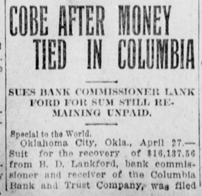 COBE AFTER MONEY TIED IN COLUMBIA SUES BANK COMMUSSIONER LANK FORD FOR SUM STILL REMAINING UNPAID. Special to the World. Oklahoma City, Okla., April 27.Suit for the recovery of $16,187.56 from B. D. Lankford, bank commissioner and receiver of the Columbia Bank and Trust Company, was filed