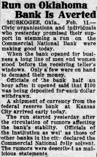 Run on Oklahoma Bank Is Averted Okla., Civic and individuals who yesterday promised their supin stemming the Commercial National Bank were making good today When the bank opened for busilong line of men and women stood before the receiving teller's windows. Only were on hand demand their money. Officials of the bank half after said that $100 being deposited dollar withdrawn shipment of currency from the federal bank at Kansas City early today. The run started yesterday after the circulation rumors the bank's stability. Officials the well those of banks the city declared the Commercial National fully solvent. The rumors were malicious statements