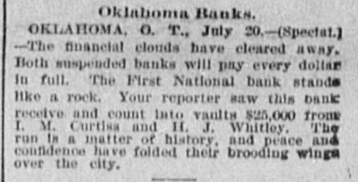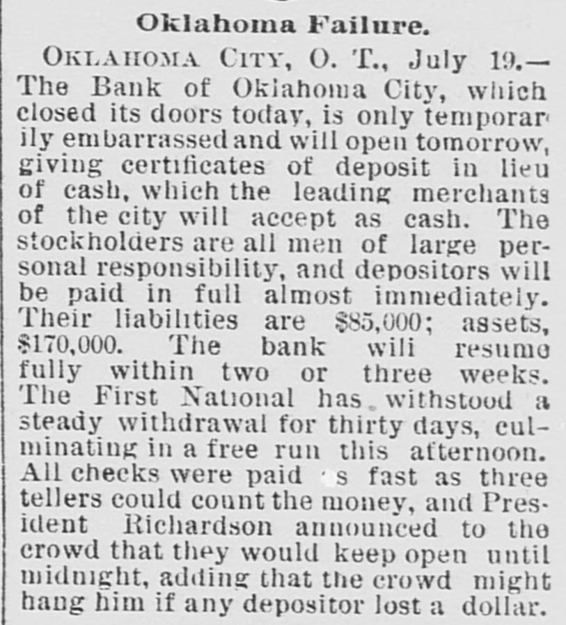 FORCED TO THE WALL. Banks and Business Concerns Fail Under the Pressure. HUTCHINSON, Kans., July 19.-Owing to the financial stringency. the Hutchinson National Bank did not open its doors this morning. Assets, $251,000; liabilities, $131,000. There is no doubt but that the depositors will be paid in full. Other local banks are well fortified and no further trouble is anticipated. TOPEKA, Kans., July 19-The State Bank Commissioner is informed of the failure of the State Bank of Parker and Wood & Sons at Yates Center. Both are small. MOBILE, Ala., July 19. - The Daily Register, one of the oldest newspapers in the South, has made an assignment. The publication will be continued under authority of the court. WASHINGTON, July 19.-The Comptroller of the Currency is informed of the failure of the Bozeman National Bank of Bozeman, Mont. CHICAGO, July 19.-Dickinson Brothers & King, dealers in cement and building material, went into the hands of a receiver to-day, through the filing of a bill by stockholders in Brooklyn. It is claimed the firm has assets of $260,000 in excess of its liabilities, but the pressure of the times and sharp competition have made the business unprofitable, and the business should be wound up. It is claimed the creditors will be paid in full and a substantial balance left. BROOKLYN, July 19.-The large carpethouse of Hardenburg & Co. has assigned. OKLAHOMA CITY, July 19.-The Bank of Oklahoma City, which closed its doors to-day, is only temporarily embarrassed and will open to-morrow, giving certificates of deposit in lieu of cash, which the leading merchants of the city will accept as cash. The liabilities of the bank are $95,000 and the assets $170,000. The Oklahoma National Bank also closed its doors. President Stiles says the assets are abundant and can be utilized a/most immediately. The First National has withstood a steady withdrawal for thirty days, culminating in a free run this afternoon. All checks were paid as fast as three tellers could count the money, and President Richardson announced that they would keep open until midnight, adding that the crowd might hang him if any depositor lost a dollar. DETROIT, July 19.-A Free Press special from Negaunee, Mich., says: Judge Burke of the Cleveland (Or.) commission firm of Corrigan, Ives & Co., now in the hands of a receiver, claims that Ferdinana Schlesinger owes the firm $270,000. which Schlesinger says is $70,000 ab ve the real figures. Burke also says the Buffalo Mining Company owes them $2,000,000. This, also, is alleged to be erroneous. Representatives of the creditors will confer with Schlesinger at Milwaukee to-morrow. NEW YORK, July 19.-The Farmers' Loan and Trust Company, as trustee, has brought suit against the D. G. Yuengling Jr. Brewery Company to foreclose a mortgage of $1,500,000 given on the brewery property to secure bonds. A lis pendens was to-day filed against the property.