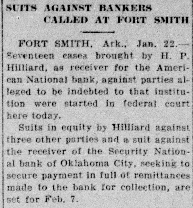 SUITS AGAINST BANKERS CALLED AT FORT SMITH FORT SMITH, Ark., Jan. 22.Seventeen cases brought by H. P. Hilliard, as receiver for the American National bank, against parties alleged to be indebted to that institution were started in federal court here today. Suits in equity by Hilliard against three other parties and a suit against the receiver of the Security National bank of Oklahoma City, seeking to secure payment in full of remittances made to the bank for collection, are set for Feb. 7.