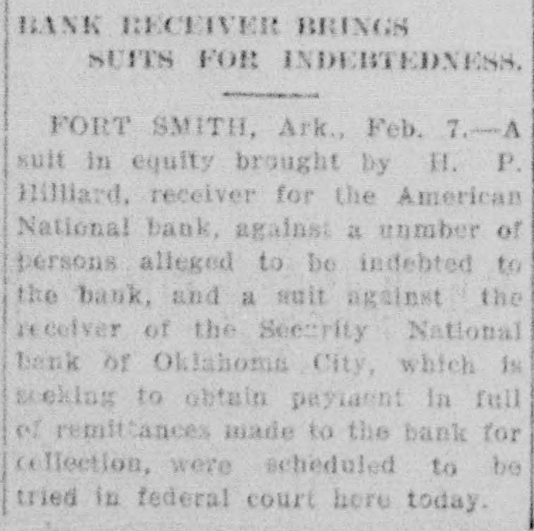 BANK RECEIVER BRINGS SUTTS FOR INDEBTEDNESS. FORT SMITH, Ark., Feb. 7.-A suit in equity brought by H. P. Hilliard. receiver for the American National bank, against a unmber of persons alleged to be indebted to the bank, and a muit against the receiver of the Security National bank of Oklahoma City, which is seeking to obtain payment in full of remittances made to the bank for collection, were scheduled to be tried in federal court here today.