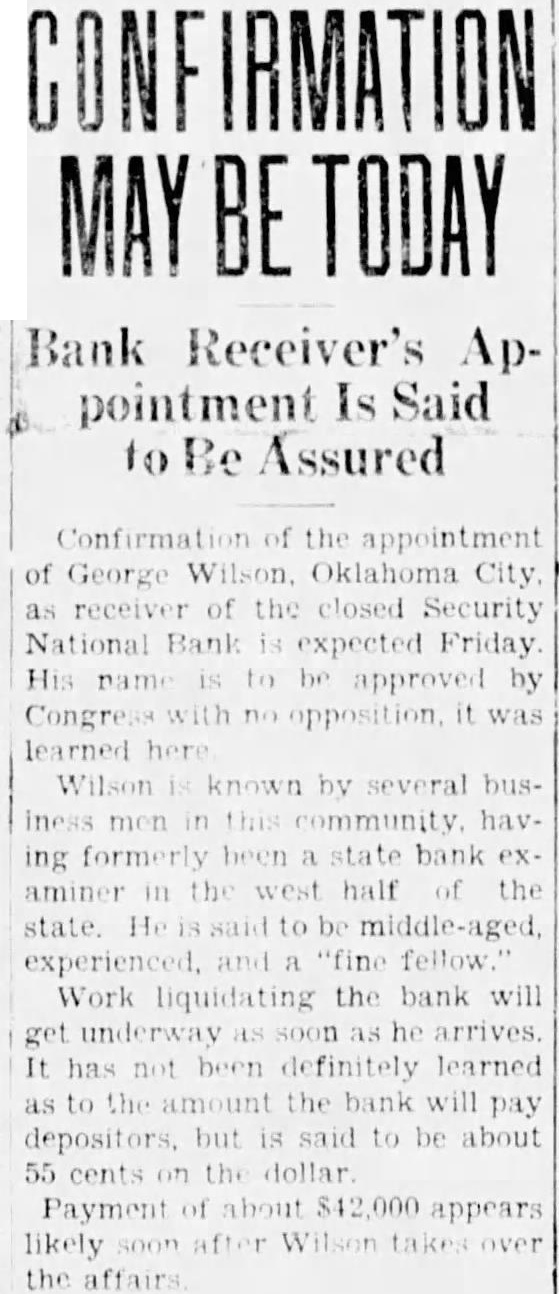 Confirmation of the appointment of George Wilson. Oklahoma City, receiver of the closed Security National Bank expected Friday His name to approved by Congress with opposition, it was learned here Wilson known by several business men community having formerly been bank aminer in the west half the state. He to be middle-aged, experienced, "fine fellow Work liquidating the bank will get underway arrives. It has not been definitely learned as to the bank will pay depositors, but said to be about 55 cents on the dollar Payment of about appears likely the affairs