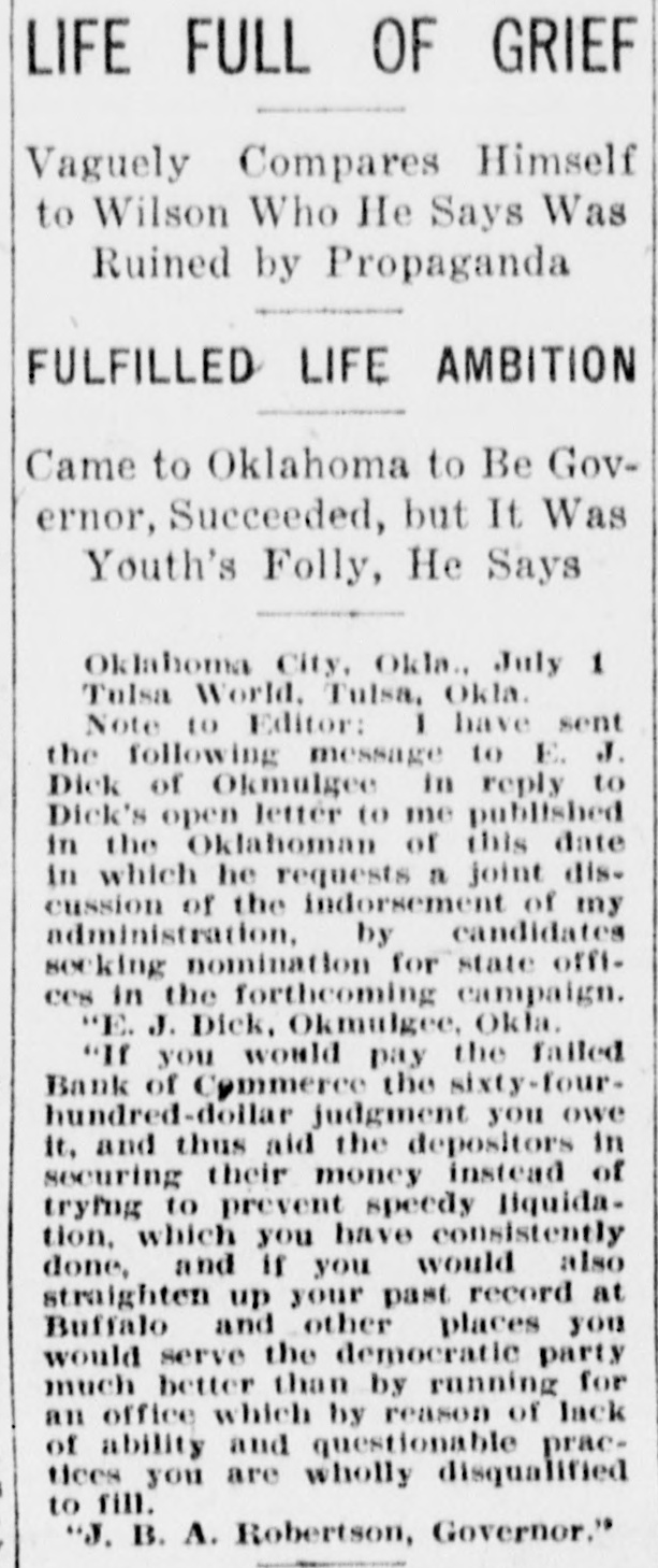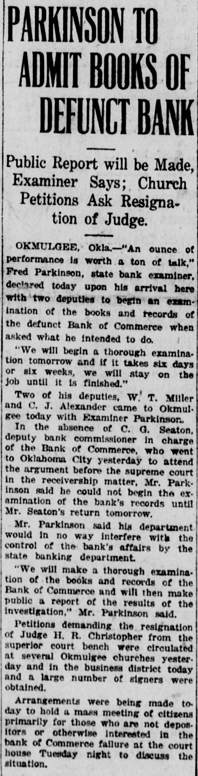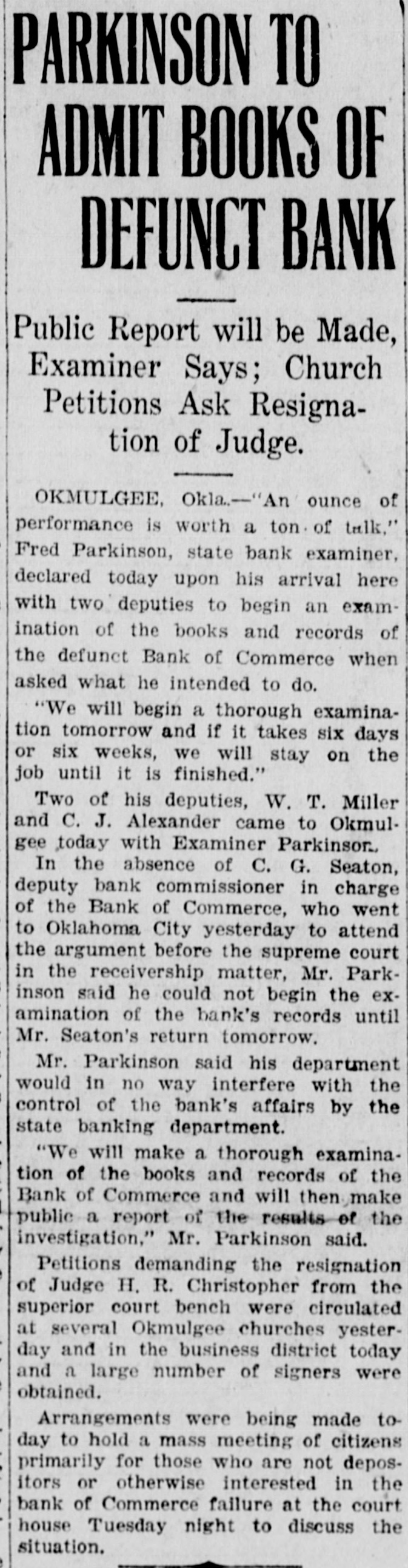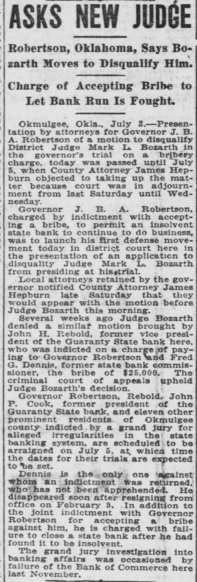 MUSKOGEE, May 22. "If there can be found one scintilla of evidence that I was ever influenced by Governor Robertson in depositing the district's money in the Bank of Commerce that failed in Okmulgee, I'll not only resign from the organization, but I will leave the United States forever," said District President John Wilkinson of district 21, United Mine Workers of America, in his reply to Oscar Ameringer, editor of the Oklahoma Leader, on the floor of the special convention of the district here this afternoon.