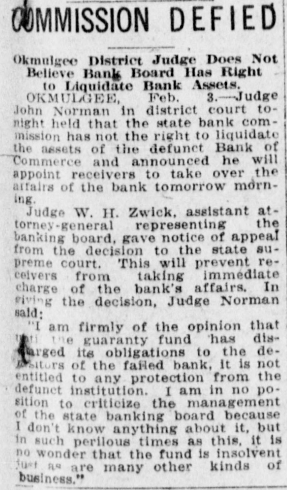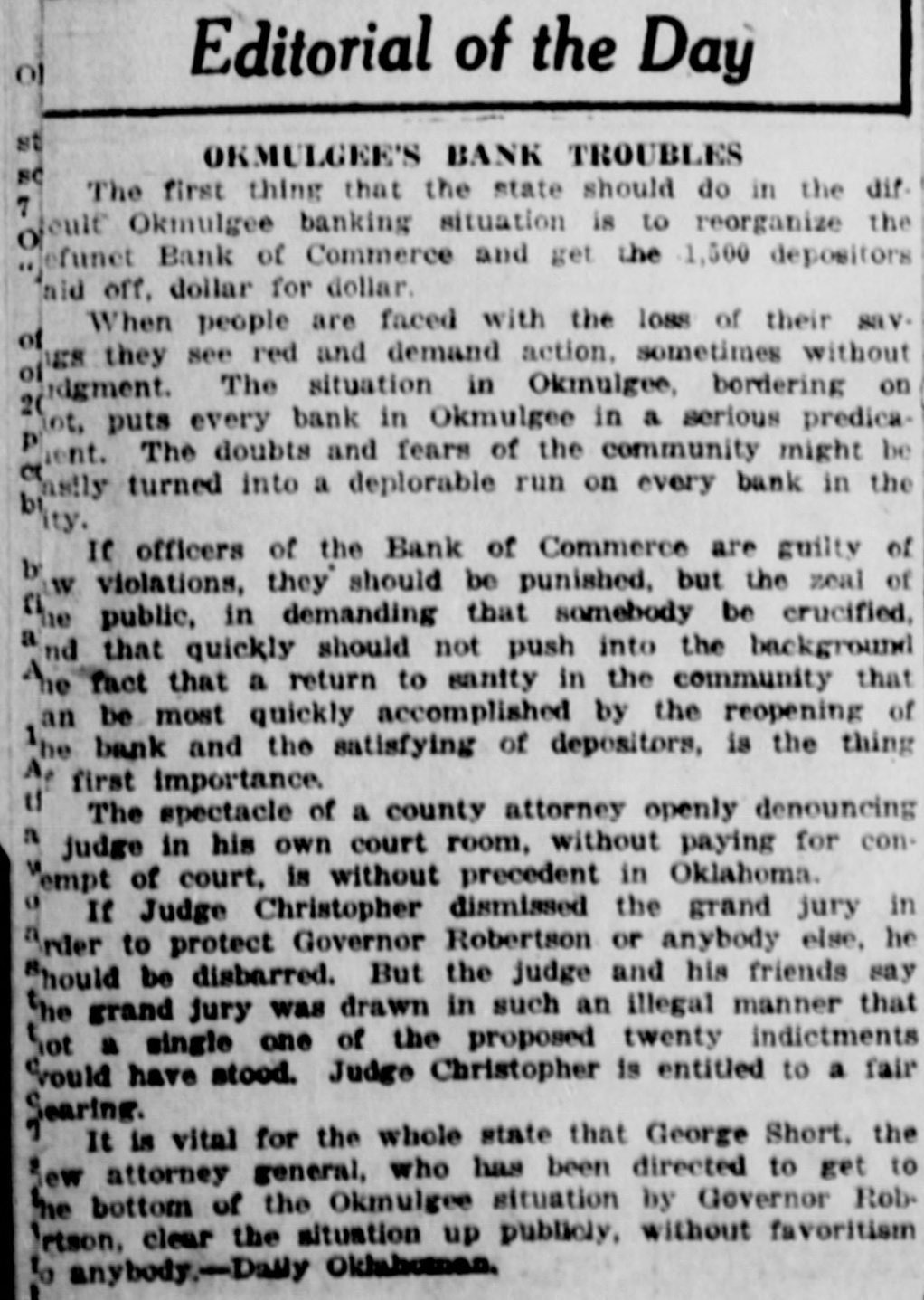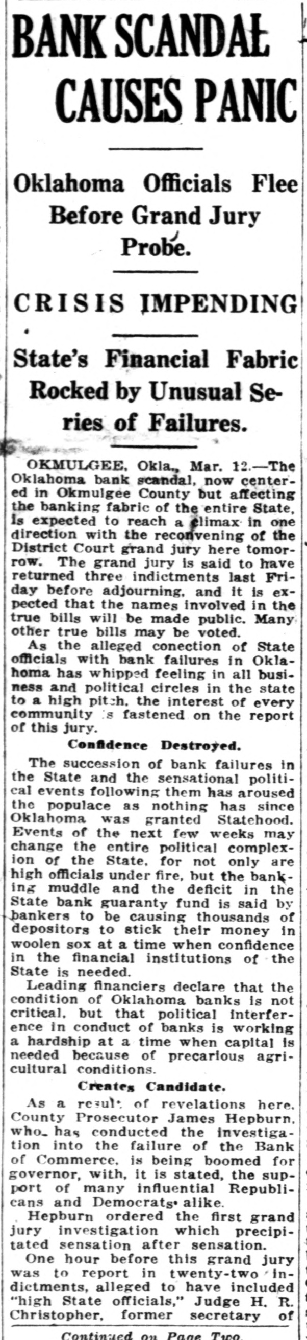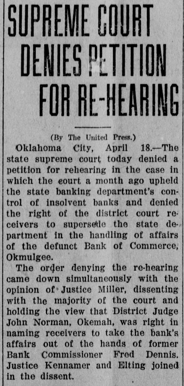 MUSKOGEE, May 22. "If there can be found one scintilla of evidence that I was ever influenced by Governor Robertson in depositing the district's money in the Bank of Commerce that failed in Okmulgee, I'll not only resign from the organization, but I will leave the United States forever," said District President John Wilkinson of district 21, United Mine Workers of America, in his reply to Oscar Ameringer, editor of the Oklahoma Leader, on the floor of the special convention of the district here this afternoon.