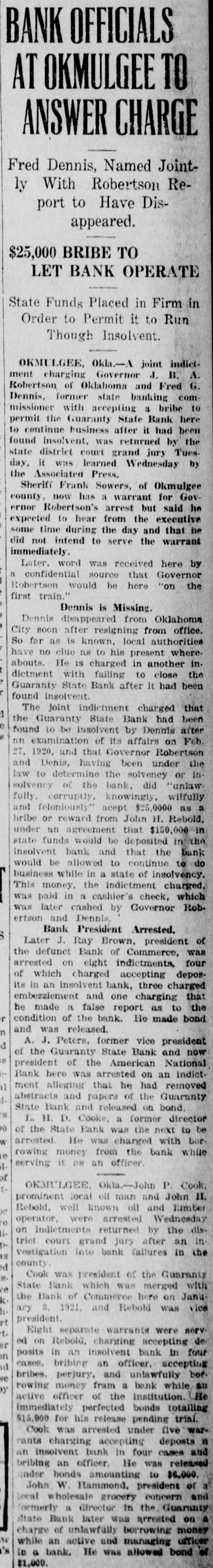 OFFICIALS AT OKMULGEE TO ANSWER CHARGE Fred Dennis, Named Jointly With Robertson Report to Have Disappeared. $25,000 BRIBE TO LET BANK OPERATE State Funds Placed in Firm in Order to Permit it to Run Though Insolvent. OKMULGEE, Okla.-A joint indictment charging Governor J. B. A. Robertson of Oklahoma and Fred G. former state with a to the permit missioner Dennis, Guaranty accepting State banking Bank bribe com- here to continue business after it had been found insolvent, was returned by the state district court grand jury Tuesday, it was learned Wednesday by the Associated Press. Sherifi Frank Sowers, of Okmulgee county, now has a warrant for Governor Robertson's arrest but said he expected to hear from the executive some time during the day and that he did not intend to serve the warrant immediately. Later, word was received here by a confidential source that Governor Robertson would be here "on the first train." Dennis is Missing. Dennis disappeared from Oklahoma City soon after resigning from office. So far as is known, local authorities have no clue as to his present where. abouts. He IS charged in another in. dietment with failing to close the Guaranty State Bank after it had been found insolvent. The joint indictment charged that 1 State be insolvent by the found Guaranty to Bank affairs Dennis had after been Feb. an examination of its on 27. 1920, and that Governor Robertson and Denis. having been under the law to determine the solvency or insolvency of the bank, did "unlawfully. corruptly, knowingly. wilfully and feloniously" acept $25,0000 as a bribe or reward from John H. Rebold, under an agreement that $150,000 state funds would be deposited in the insolvent bank and that the bank would be allowed to continue to do business while in a state of insolvency. This money, the indictment charged, was paid in a cashier's check, which was later cashed by Governor Rob. ertson and Dennis, Bank President Arrested. S Later J. Ray Brown, president of the defunct Bank of Commerce, was arrested on eight indictments, four of which charged accepting deposits in an insolvent bank, three charged embezzlement and one charging that he made a false report as to the r condition of the bank. He made bond and was released. in d A. J. Peters, former vice president of the Guaranty State Bank and now president of the American National Bank here was arrested on an indict1 ment alleging that he had removed I abstracts and papers of the Guaranty State Bank and released on bond. 's L. H. D. Cooke, a former director 0 of the State Bank was the next to be w arrested He was charged with bore rowing money from the bank while 1. serving it DS an officer. of t OKMULGEE. Okla.-John P. Cook. prominent local oil man and John H. well known oil and number were arrested e returned 1. operator. on Rebold, indictments after by Wednesday the district court grand jury an inis vestigation into bank failures in the county d Cook was president of the Guaranty e State Bank which was merged with k the Bank of Commerce here on Janu. 1. ary 3. 1921. and Rebold was vice president. rt t. Eight separate warrants were serv r ed on Rebold, charging accepting de n posits in an insolvent bank in four d cases. bribing an officer, accepting se bribes. perjury. and unlawfully bor. y rowing money fram a bank while an active officer of the institution. He immediately perfected bonds totalling $15,000 for his release pending trial. Cook was arrested under five warrants charging accepting deposts n an insolvent bank in four cases and bribing an officer. He was released under bonds amounting to $6,000. John W. Hammond, president or a local wholesale grocery concern and formerly a director in the Guaranty State Bank later was arrested on a charge of unlawfully borrowing money while an active and managing officer 's in a bank. He was allowed bond of $1,000.