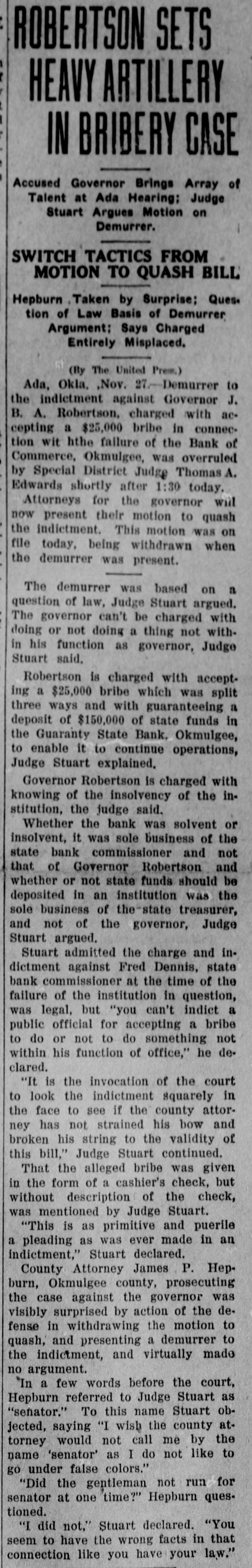 ROBERTSUN SETS HEAVY ARTILLERY IN BRIBERY CASE Accused Governor Brings Array of Talent at Ada Hearing: Judge Stuart Argues Motion on Demurrer. SWITCH TACTICS FROM MOTION TO QUASH BILL Hepburn Taken by Surprise: Ques. tion of Law Basis of Demurrer Argument: Says Charged Entirely Misplaced. (By The United Prem.) Ada, Okla, Nov. 27.-Demurrer to the indictment against Governor J. B. A. Robertson, charged with accepting a $25,000 bribe in connection wit hthe failure of the Bank of Commerce, Okmulgee, was overruled by Special District Judge Thomas A. Edwards shortly after 1:30 today. Attorneys for the governor will now present their motion to quash the indictment. This motion was on file today, being withdrawn when the demurrer was present. The demurrer was based on a question of law, Judge Stuart argued. The governor can't be charged with doing or not doing a thing not within his function as governor, Judge Stuart said. Robertson is charged with accepting a $25,000 bribe which was split three ways and with guaranteeing a deposit of $150,000 of state funds in the Guaranty State Bank, Okmulgee, to enable it to continue operations, Judge Stuart explained, Governor Robertson is charged with knowing of the insolvency of the institution, the judge said. Whether the bank was solvent or insolvent, it was sole business of the state bank commissioner and not that of Governor Robertson and whether or not state funds should be deposited in an institution was the sole business of the-state treasurer, and not of the governor, Judge Stuart argued. Stuart admitted the charge and indictment against Fred Dennis, state bank commissioner at the time of the failure of the institution in question, was legal, but "you can't indict a public official for accepting a bribe to do or not to do something not within his function of office," he declared. "It is the invocation of the court in the to look face the to see indictment if the county squarely attorney has not strained his bow and broken his string to the validity of this was given That bill," the Judge alleged Stuart bribe continued. in the form of a cashier's check, but without description of the check, was mentioned by Judge Stuart. puerile "This is as primitive made and in a pleading as was ever an indictment," Stuart declared. County Attorney James P. Hep. the was burn, case Okmulgee against county, the governor prosecuting visibly surprised by action of the defense in withdrawing the motion to quash, and presenting a demurrer to the indictment, and virtually made no argument. "In a few words before the court, Hepburn referred to Judge Stuart as "senator." To this name Stuart objected, saying "I wish the county attorney would not call me by the name 'senator' as I do not like to go under false colors." "Did the gentleman not run for senator at one time?" Hepburn questioned. "I did not," Stuart declared. "You seem to have the wrong facts in that connection like you have your law."